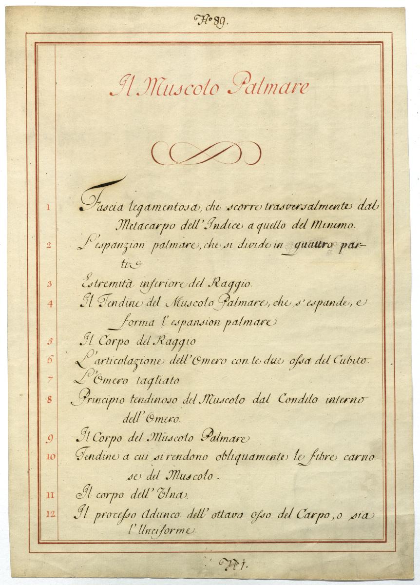 Der Text ist die ergänzende Beschreibung in italienischer Sprache zum anatomischen Wachsmodell der Unterarmmuskeln.