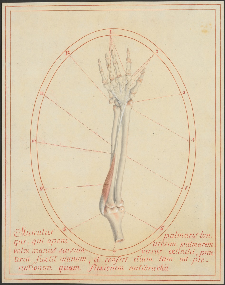 Distaler Oberarmknochen (Humerus), Unterarmknochen – Elle (Ulna) und Speiche (Radius) und Knochen der Hand der rechten Seite von vorne. Musculus palmaris longus mit der Palmaraponeurose (Aponeurosis palmaris) bis zum Ligamentum metacarpale transversum superficiale.