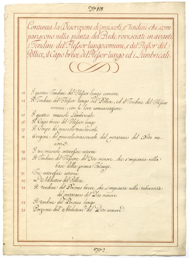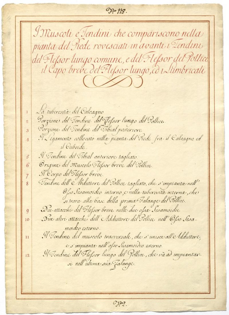 Der Text ist die ergänzende Beschreibung in italienischer Sprache zum anatomischen Wachsmodell der Muskeln der Fußsohle.