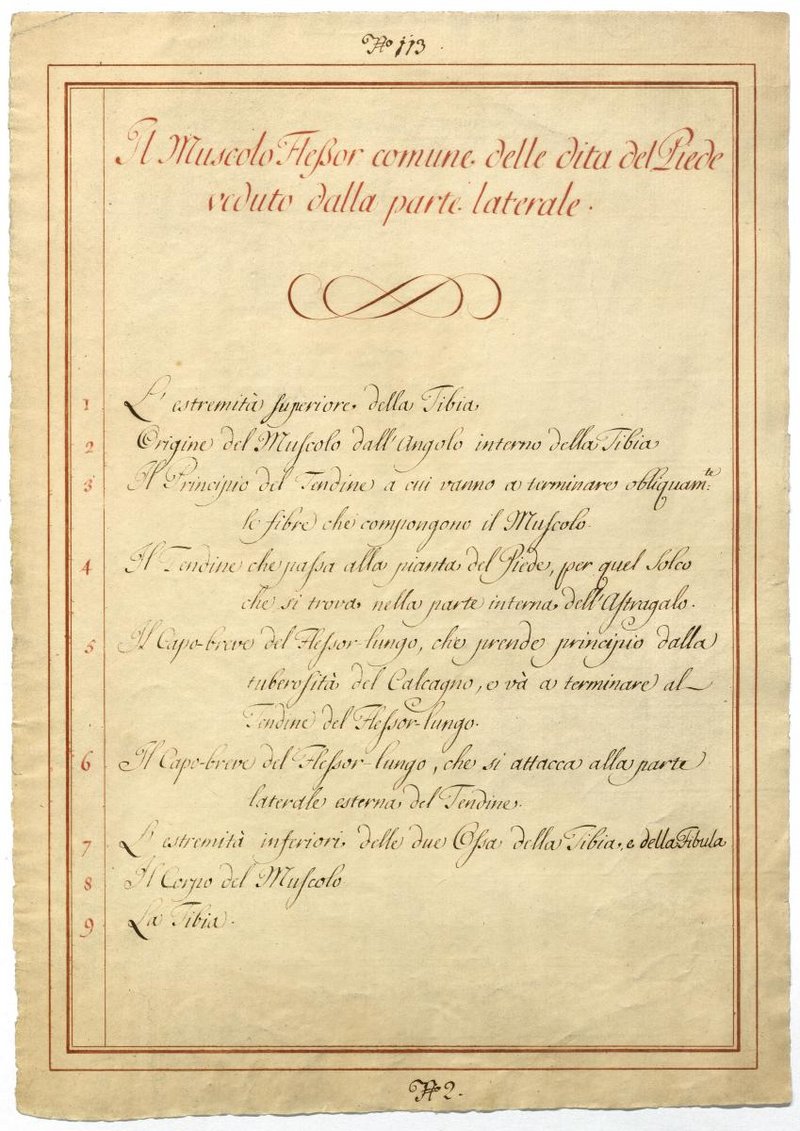 Der Text ist die ergänzende Beschreibung in italienischer Sprache zum anatomischen Wachsmodell der Muskeln der tiefen Beuger-Loge.