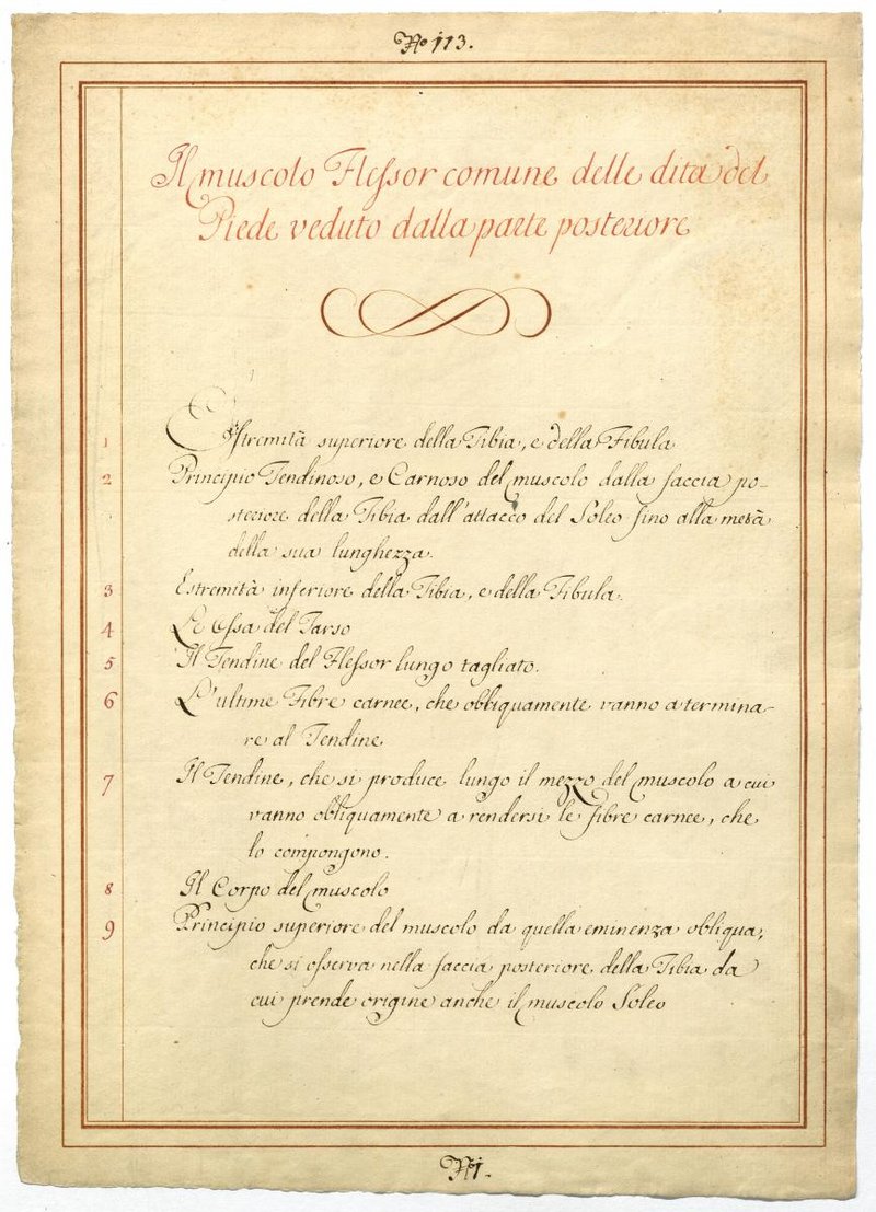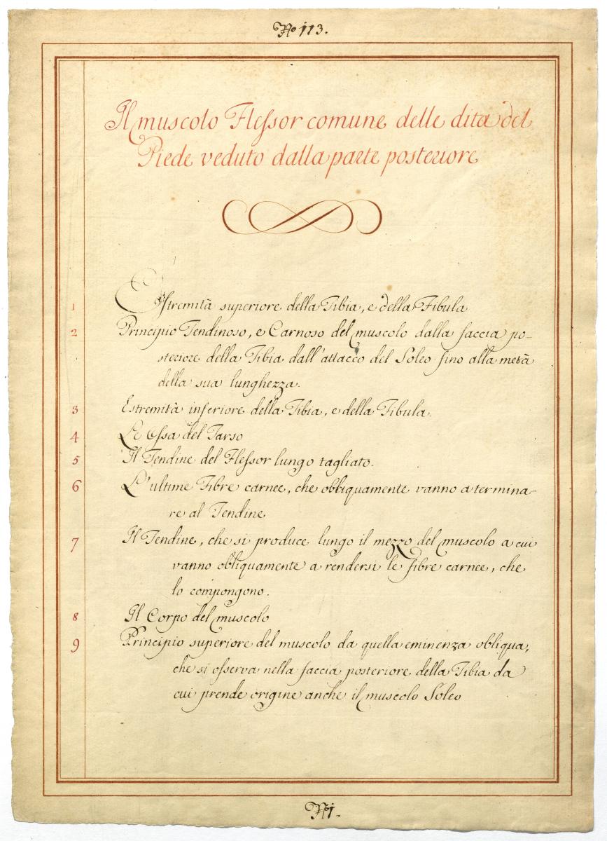 Der Text ist die ergänzende Beschreibung in italienischer Sprache zum anatomischen Wachsmodell der Muskeln der tiefen Beuger-Loge.