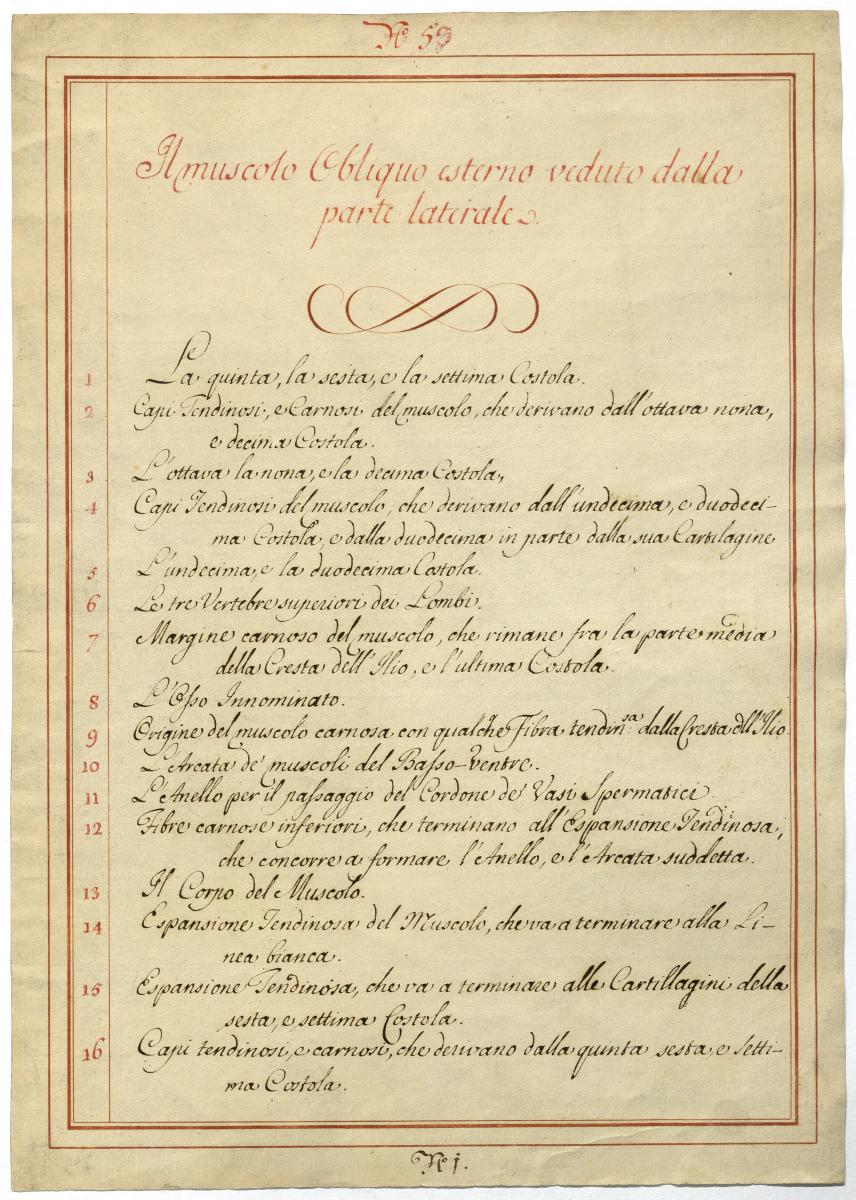 Der Text ist die ergänzende Beschreibung in italienischer Sprache zum anatomischen Wachsmodell der Bauchmuskulatur.