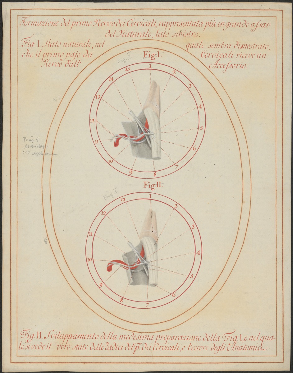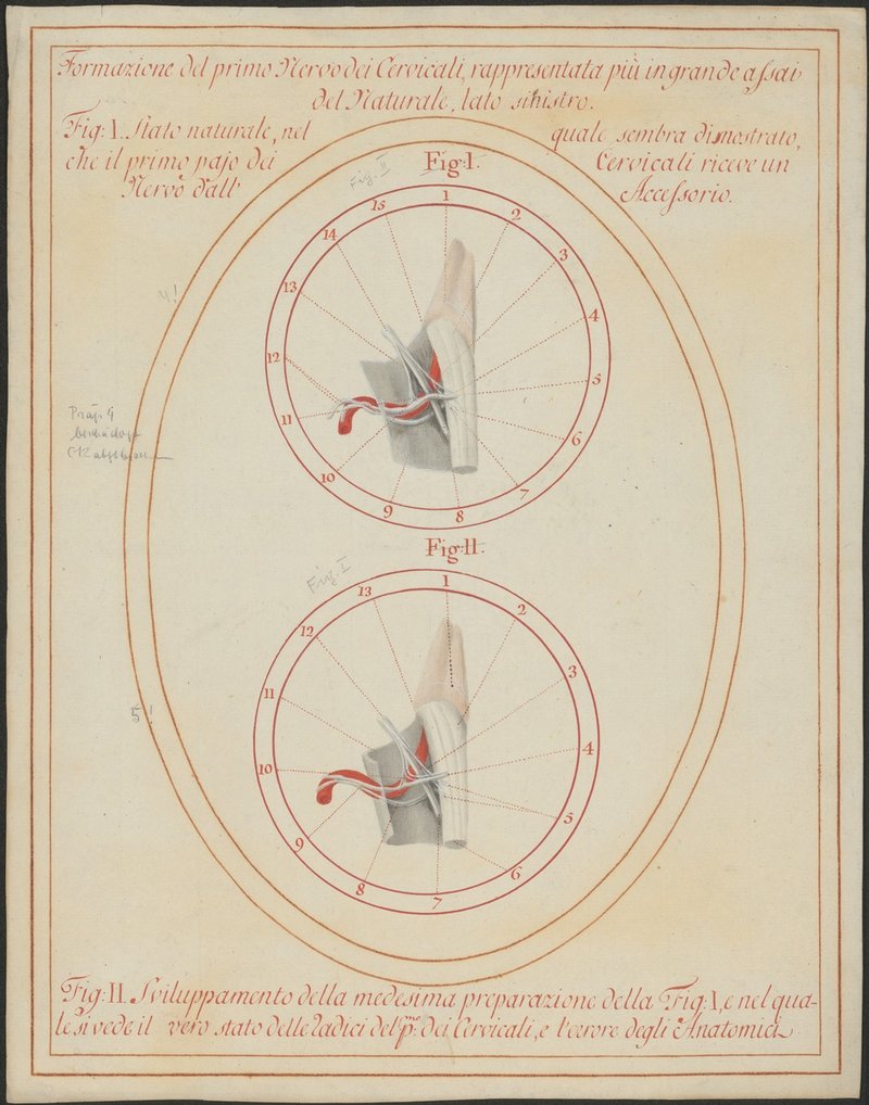 Der linke erste Spinalnerv (Nervus spinalis cervicalis I.) und seine Beziehungen zur Wirbelarterie (Arteria vertebralis) und zu den spinalen Wurzeln des 11. Hirnnerven (Radices spinales nervi accessorii), vergrößert.