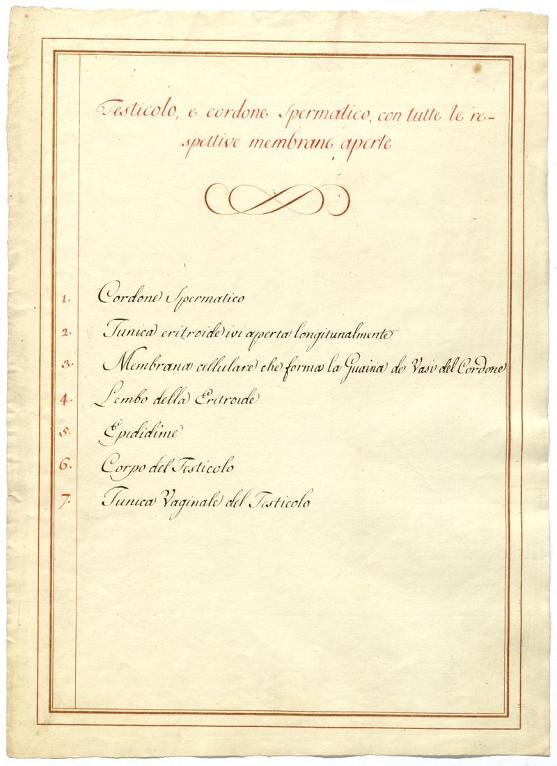 Der Text ist die ergänzende Beschreibung in italienischer Sprache zum anatomischen Wachsmodell der Hoden.