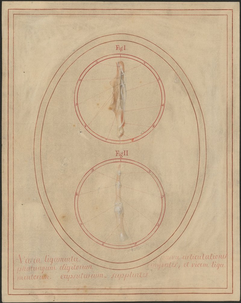 Fig. 1: 11/8: Der Mittelfinger mit der geöffneten Sehnenscheide der Beugesehnen, die als Leitkanal für die Sehnen des tiefen und oberflächlichen Fingerbeugers (Musculus flexor digitorum profundus et m. flexor digitorum superficialis) dient. Man sieht die typische Perforans-Perforatus-Beziehung der Sehnen der Fingerbeuger. Hierbei setzt der oberflächliche Fingerbeuger (Musculus flexor digitorum superficialis -> Perforatus) bereits auf Höhe des Mittelgliedes des Fingers an, der tiefe Fingerbeuger (Musculus flexor digitorum profundus) muss ihn in seinem Verlauf zum Ansatz am Fingerendglied durchbohren (Perforans). Fig. 2: 11/10: Der rechte Mittelfinger und die Seitenbänder seiner Gelenke (Ligamenta collateralia).