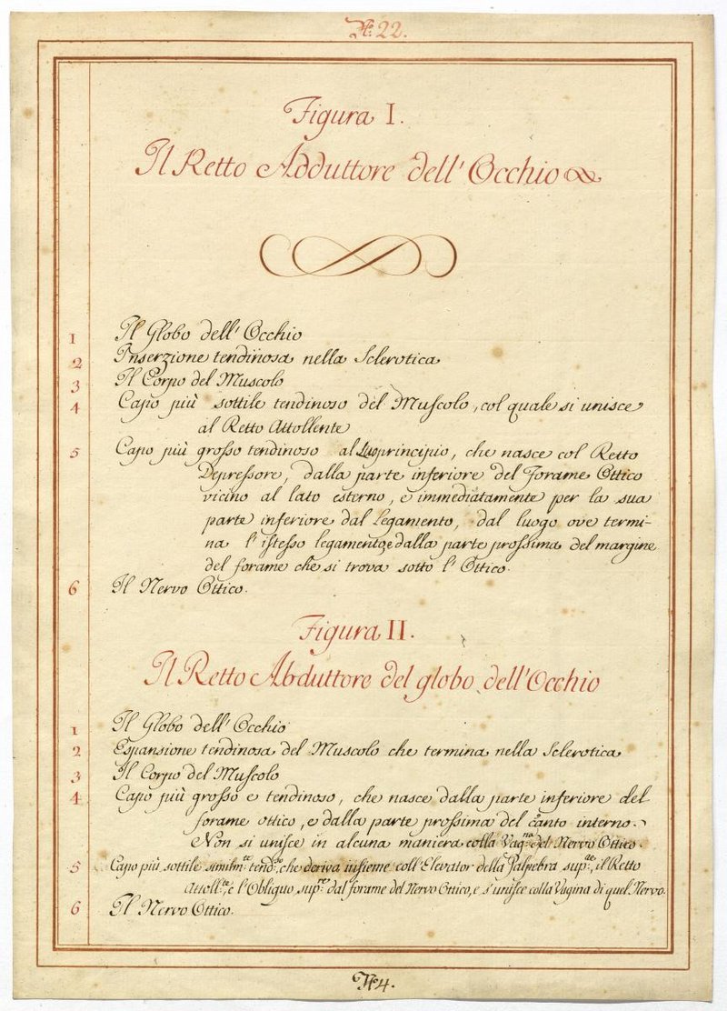 Der Text ist die ergänzende Beschreibung in italienischer Sprache zum anatomischen Wachsmodell der Augenmuskeln.