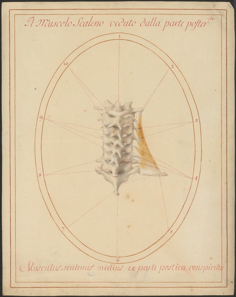 Isoliertes Modell der sieben Halswirbeln und des ersten Brustwirbels inklusive rechter erster Rippe von dorsal. Rechter Musculus scalenus medius, wobei ein Ursprung vom 1. Halswirbel untypisch ist.