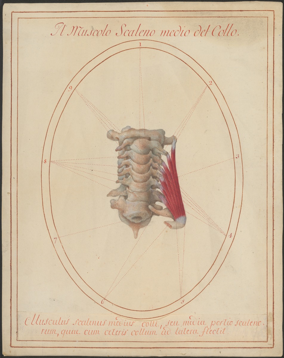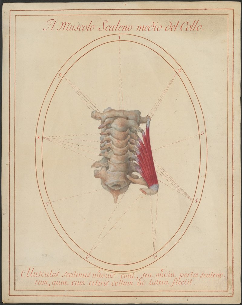 3. Isoliertes Modell der sieben Halswirbeln und des ersten Brustwirbels inklusive linker erster Rippe von vorne. Linker Musculus scalenus medius, wobei ein Ursprung vom 1. Halswirbel untypisch ist.