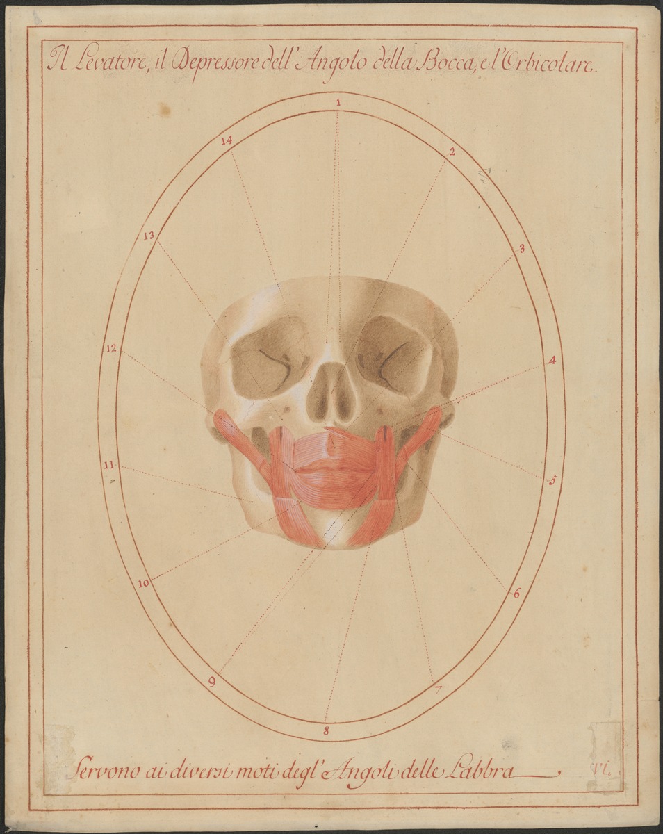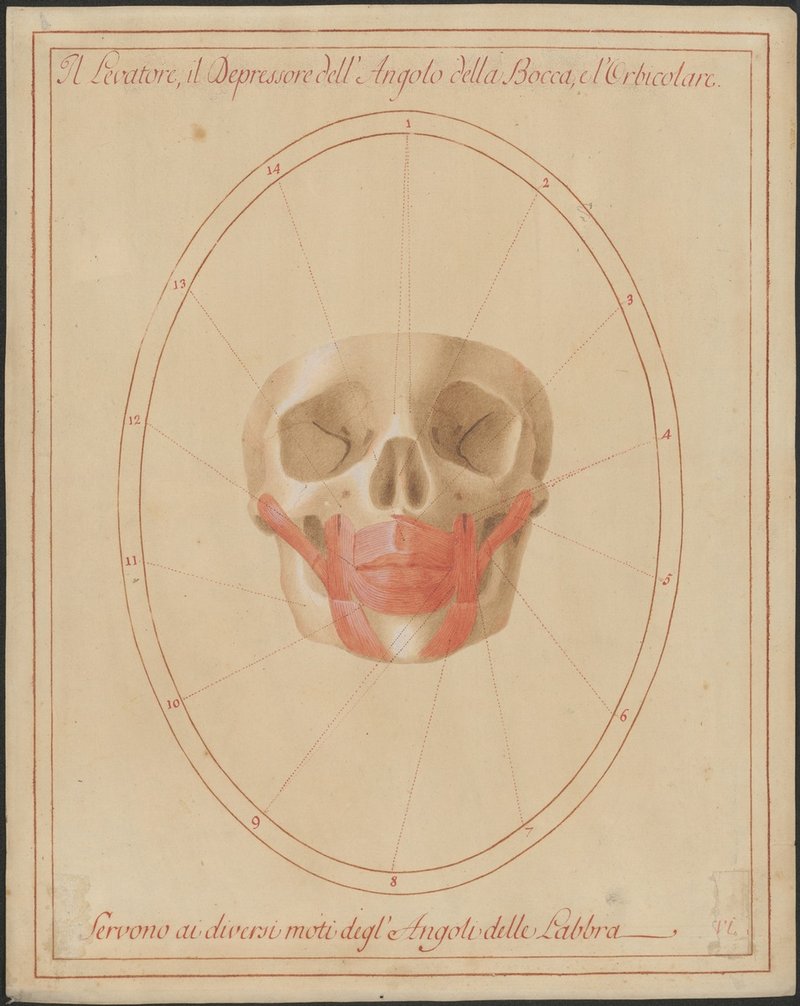 Musculus levator anguli oris, Musculus zygomaticus major, Musculus depressor anguli oris und Musculus orbicularis oris. Der Nasenknorpel ist entfernt.