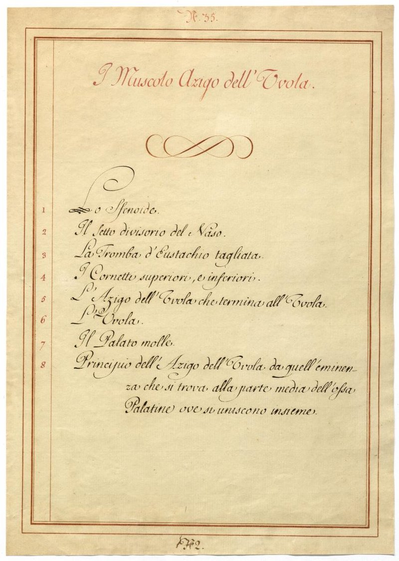 Der Text ist die ergänzende Beschreibung in italienischer Sprache zum anatomischen Wachsmodell der Gaumenmuskulatur.