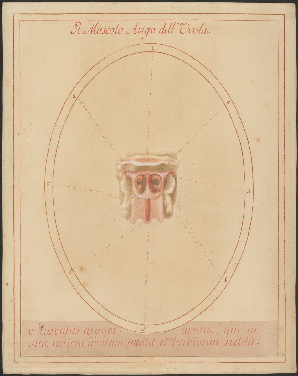 Isoliertes Modell des Bereiches der inneren Nasenöffnungen (Choanen) der Schädelbasis von dorsal. Links und rechts der durch die Nasenscheidenwand getrennten Choanen sieht man die Einmündung der Ohrtrompete (Tuba auditiva). Nach unten hin ist hell herabhängend der weiche Gaumen dargestellt, in der Mitte sieht man den Muskel des Zäpfchens (Musculus uvulae).