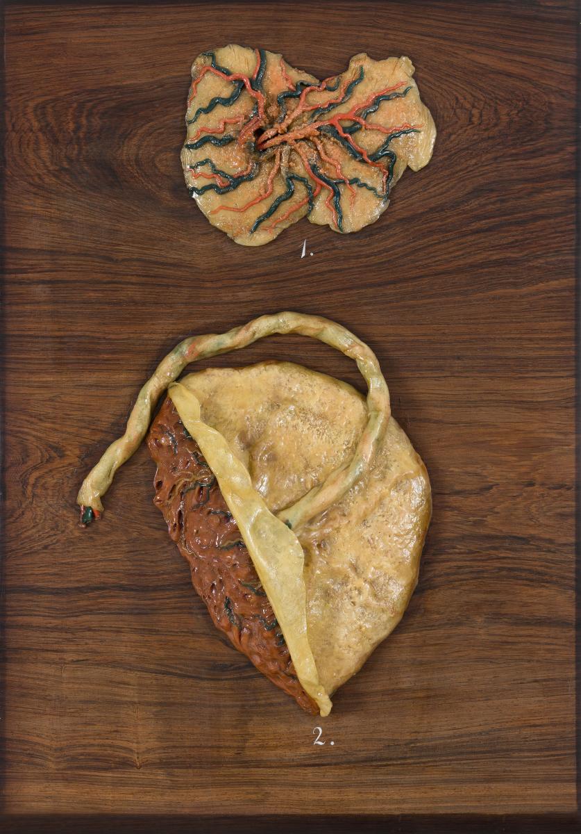 1. Mutterkuchen (Placenta) mit seinen Gefäßen. 2. Schnitt durch den Mutterkuchen (Placenta).