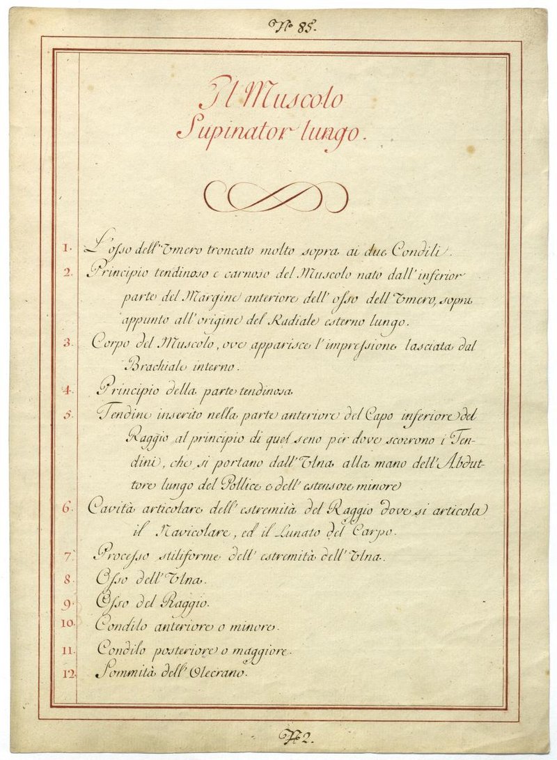 Der Text ist die ergänzende Beschreibung in italienischer Sprache zum anatomischen Wachsmodell des Ellenbogenbeugers.
