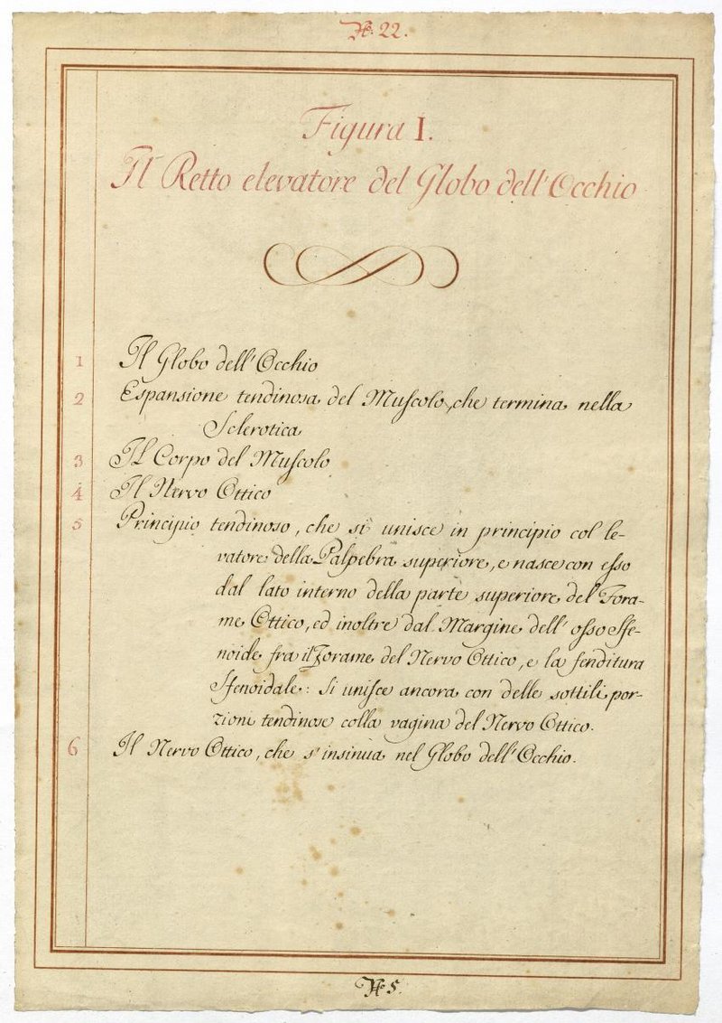Der Text ist die ergänzende Beschreibung in italienischer Sprache zum anatomischen Wachsmodell der Augenmuskeln.