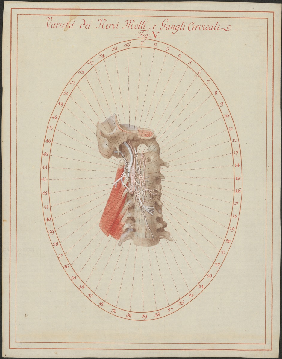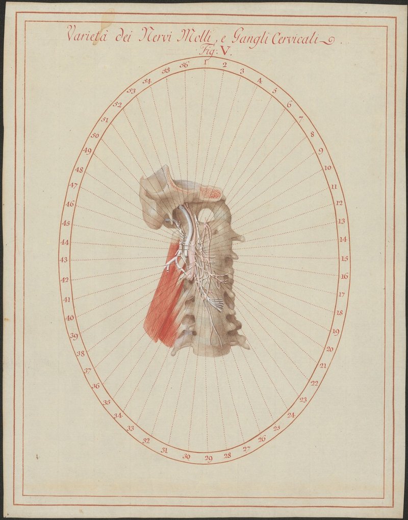 3. Der obere Halsabschnitt des Grenzstranges mit dem oberen Halsganglion (Truncus sympathicus et ganglion cervicale superius), der 9. und der 11. Hirnnerv (N. glossopharyngeus et n. accessorius) und der Stamm des 10. Hirnnerven (N. vagus) der rechten Seite (nach Entfernung der Halseingeweide und Muskeln).