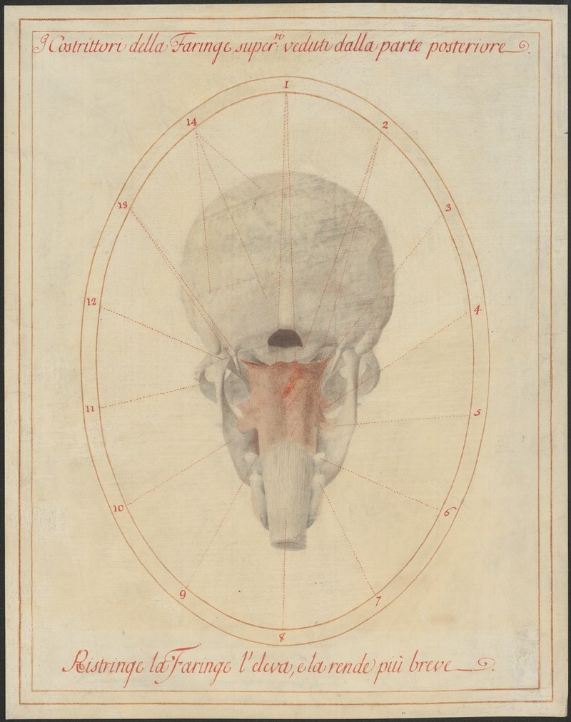 Schädel mit Unterkiefer von dorsal, man sieht den Musculus constrictor pharyngis superior. Die weiterführende Rachenmuskulatur ist entfernt, der Verlauf des Rachens und der Übergang zur Speiseröhre ist als Schleimhaut angedeutet. Links und rechts davon sind die dorsalen Anteile von Zungenbein (oben) und Schildknorpel (unten) zu sehen. Ein Muskelzug direkt vom Unterkiefer zum Rachen ist üblicherweise nicht vorhanden.