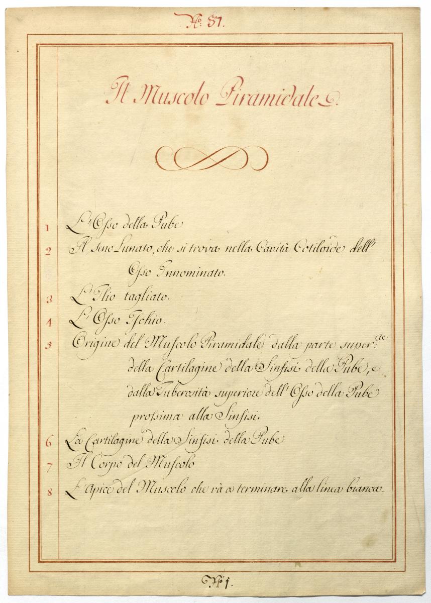 Der Text ist die ergänzende Beschreibung in italienischer Sprache zum anatomischen Wachsmodell der vorderen Bauchmuskeln.