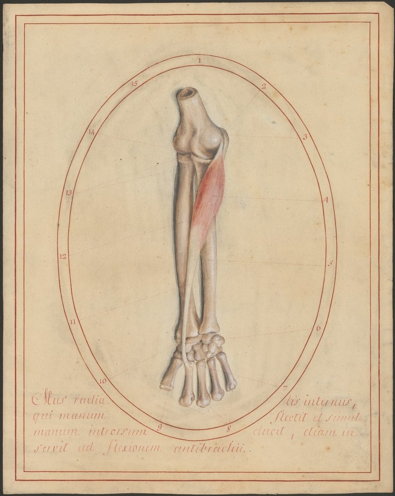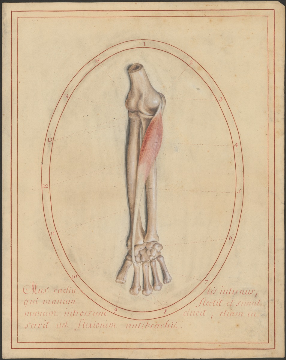 Distaler Oberarmknochen (Humerus), Unterarmknochen – Elle (Ulna) und Speiche (Radius), Handwurzelknochen und Mittelhandknochen der rechten Seite von vorne. Musculus flexor carpi radialis.