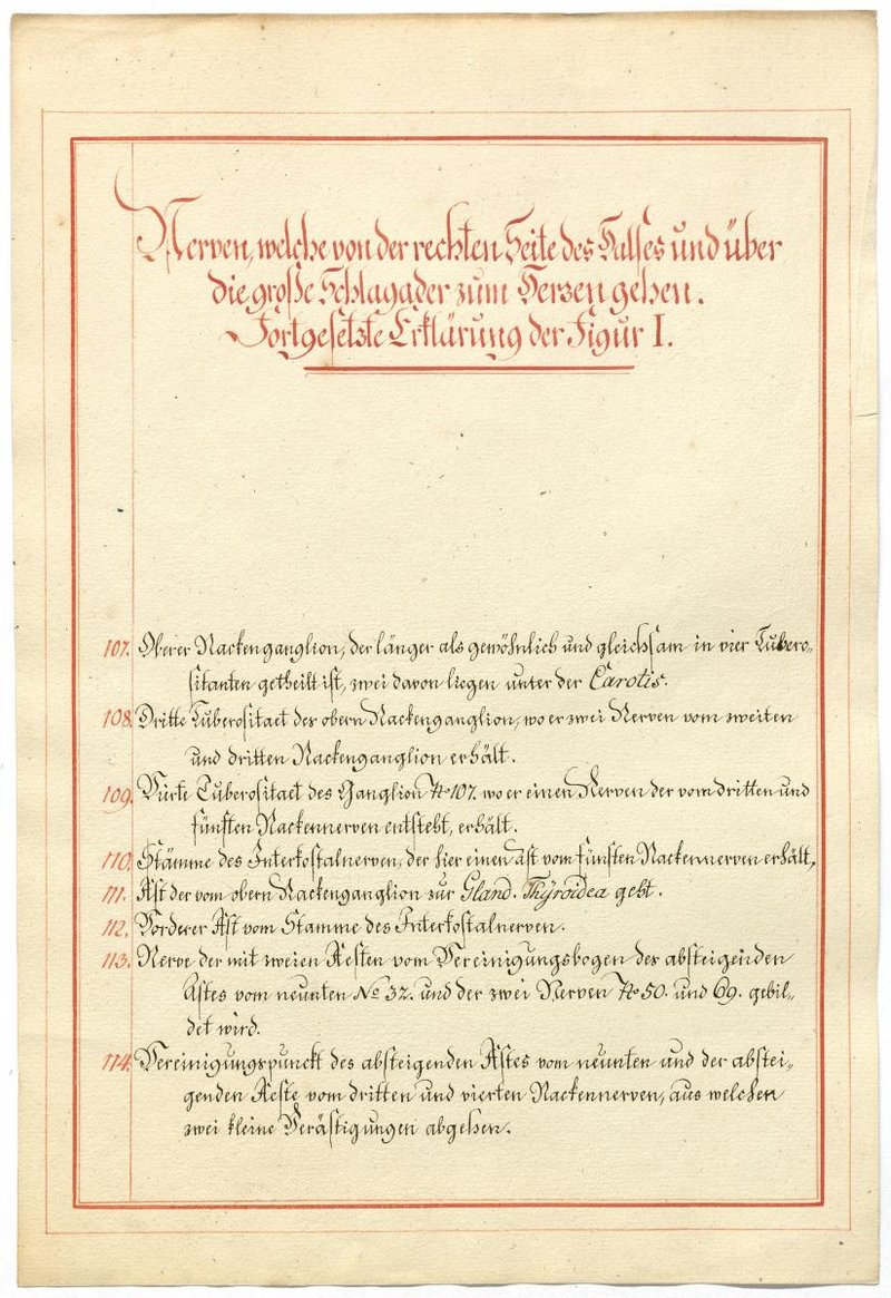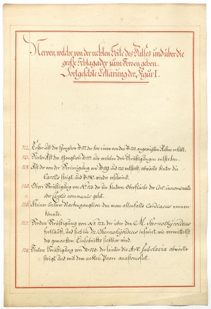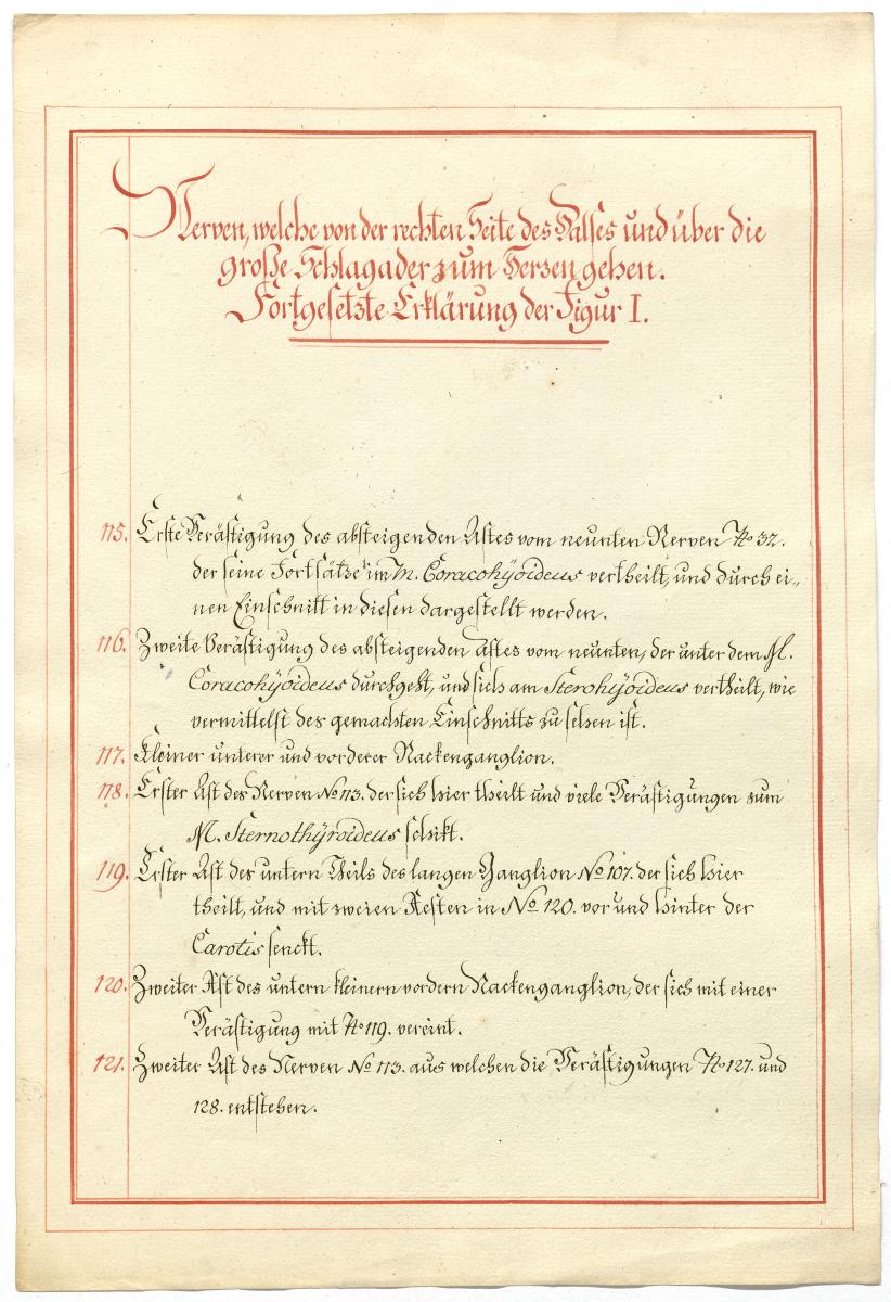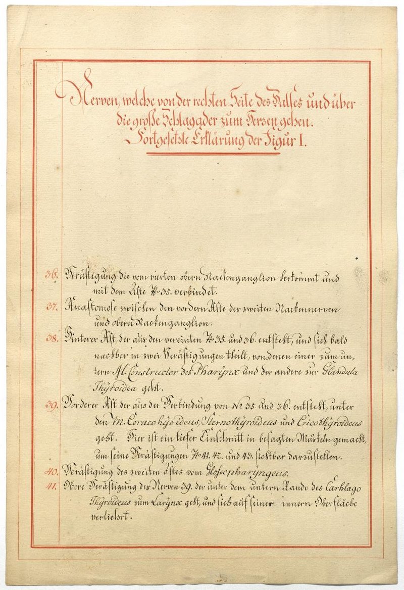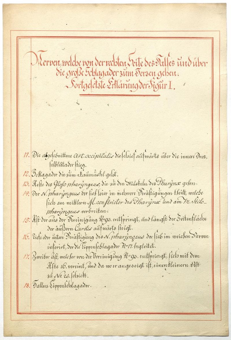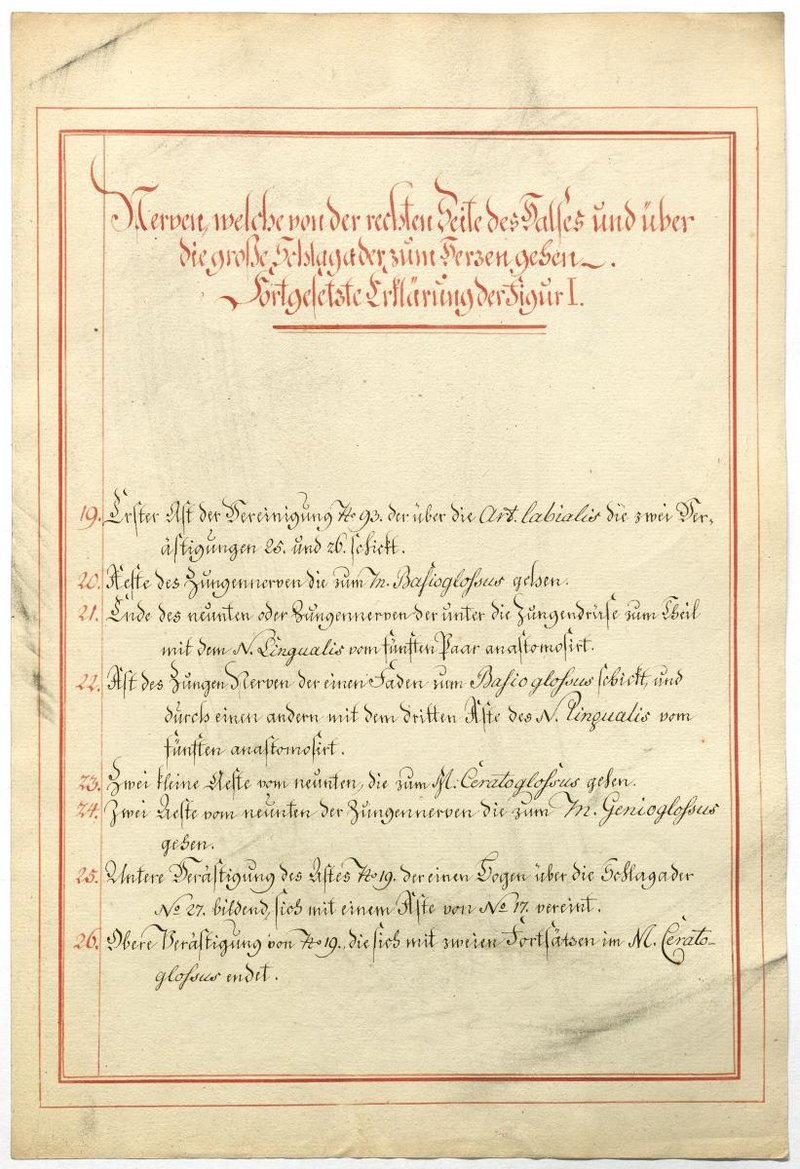 Der Text ist die ergänzende Beschreibung in deutscher Sprache zum anatomischen Wachsmodell des Nervus hypoglossus und Plexus cervicalis. Blatt 18 fehlt.