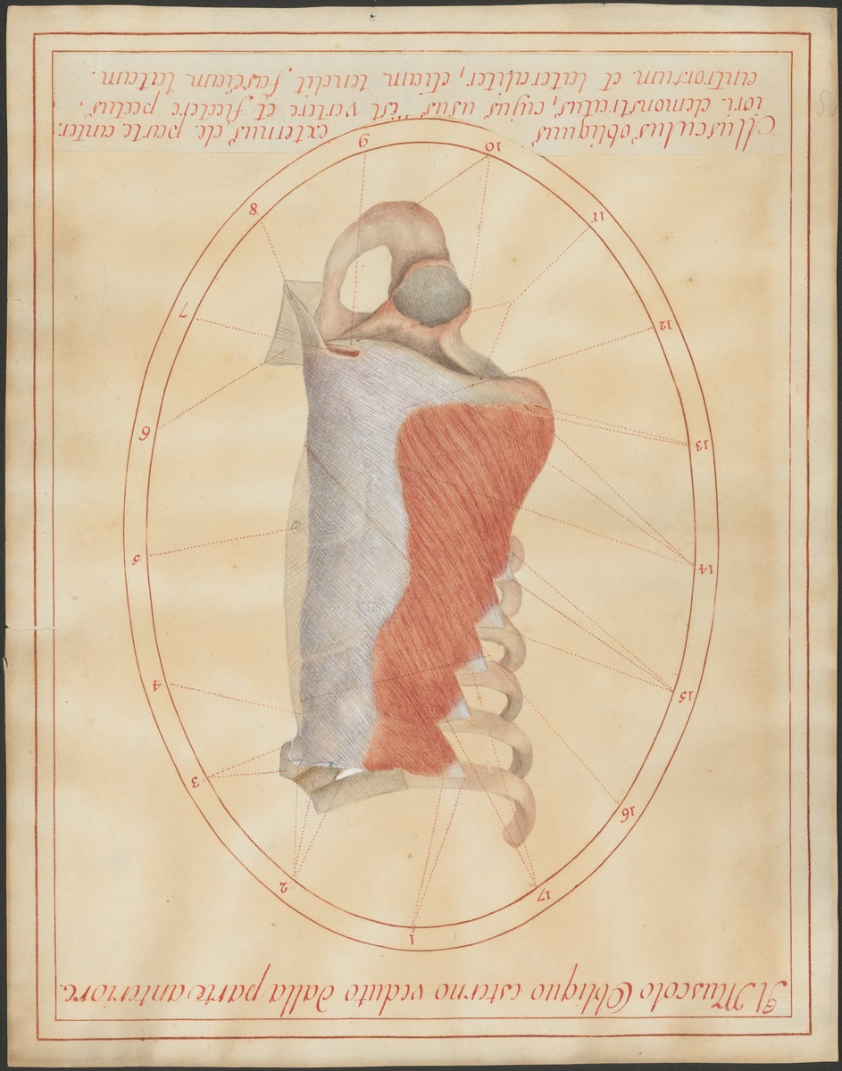 Der rechte äußere schiefe Bauchmuskel (M. obliquus externus abdominis), von vorn seitlich.
