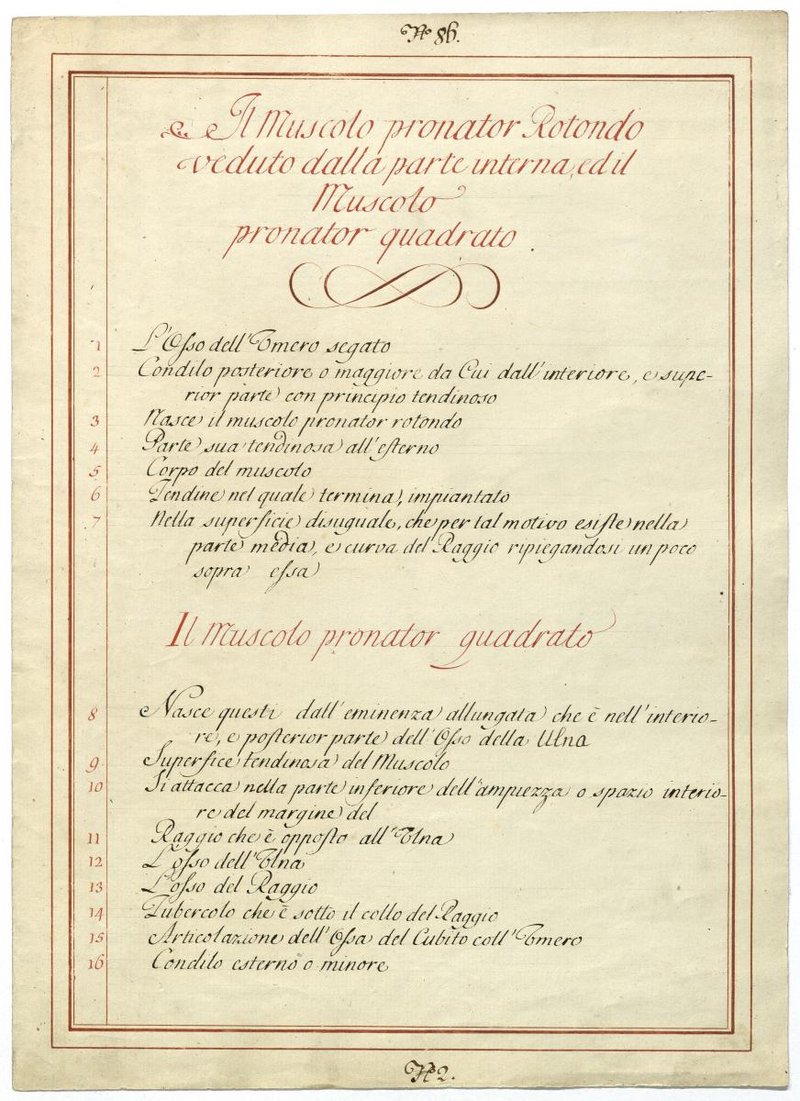 Der Text ist die ergänzende Beschreibung in italienischer Sprache zum anatomischen Wachsmodell der Unterarmmuskeln.