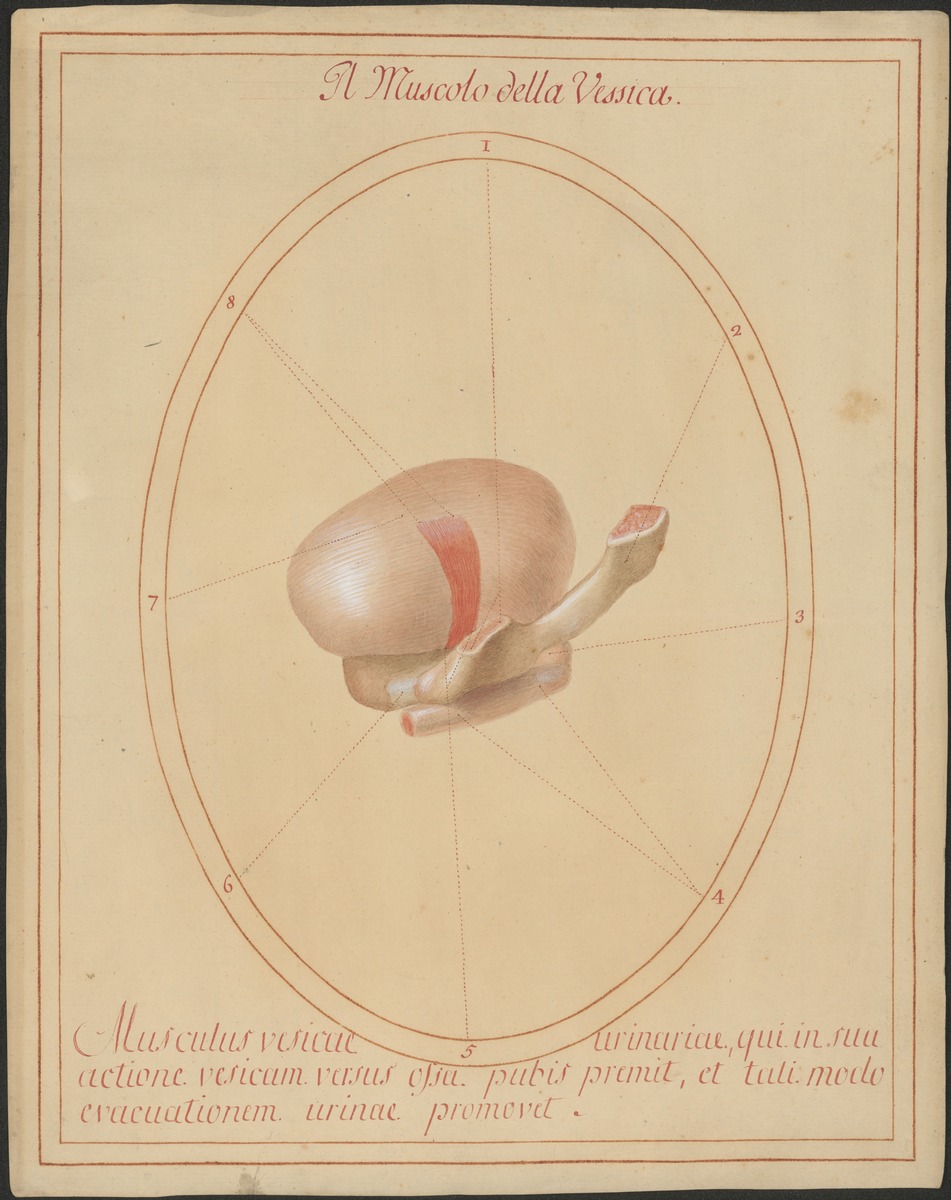 Isoliertes Modell der linken Harnblasenwand, des unteren Schambeinastes in einem männlichen Modell. Der Musculus pubovesicalis ist von der Seite dargestellt.