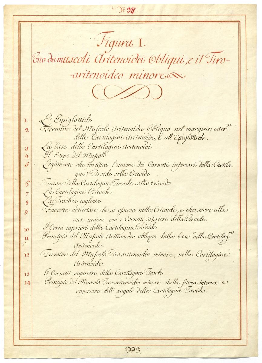Der Text ist die ergänzende Beschreibung in italienischer Sprache zum anatomischen Wachsmodell der Kehlkopf- und Rachenmuskulatur.