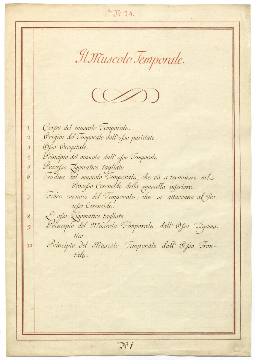 Der Text ist die ergänzende Beschreibung in italienischer Sprache zum anatomischen Wachsmodell der Kaumuskulatur.