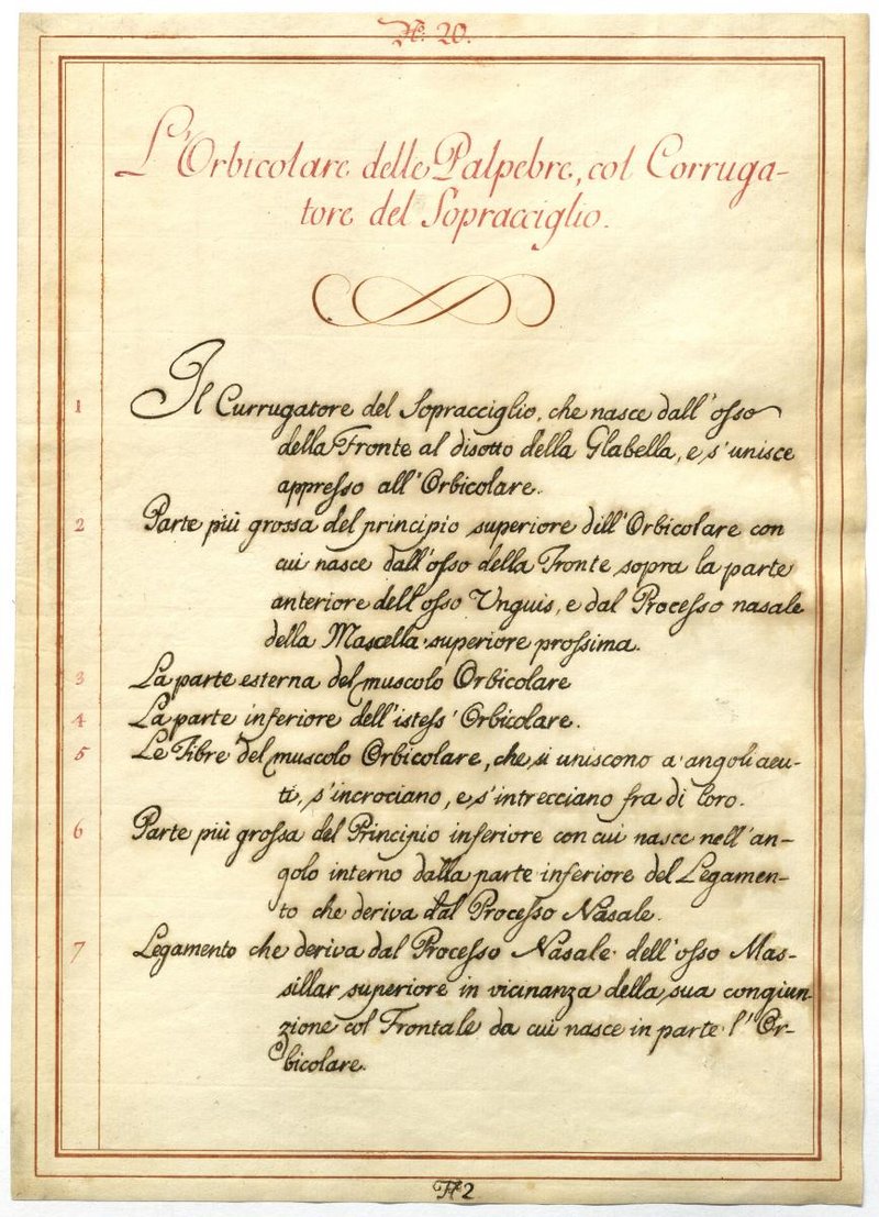 Der Text ist die ergänzende Beschreibung in italienischer Sprache zum anatomischen Wachsmodell der Schädelmuskulatur.