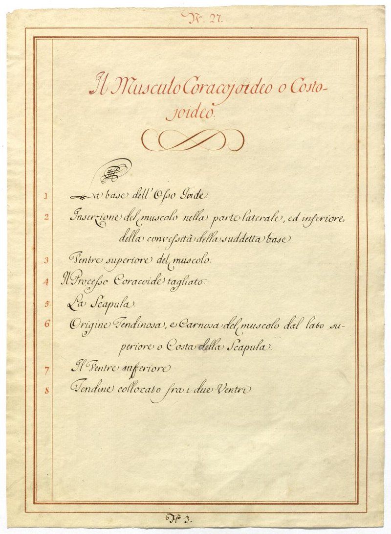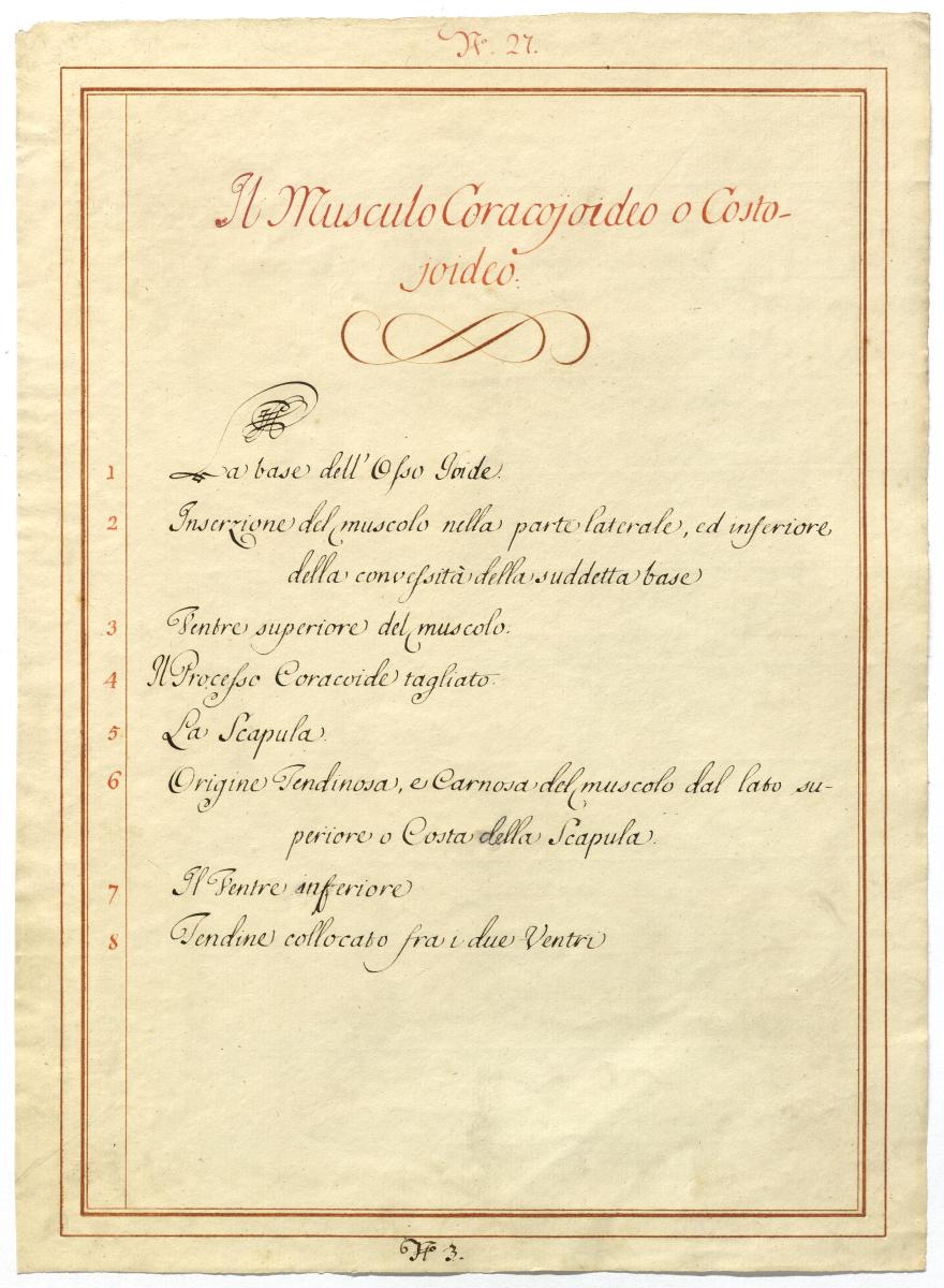 Der Text ist die ergänzende Beschreibung in italienischer Sprache zum anatomischen Wachsmodell der Ober- und Unterzungenbeinmuskulatur.