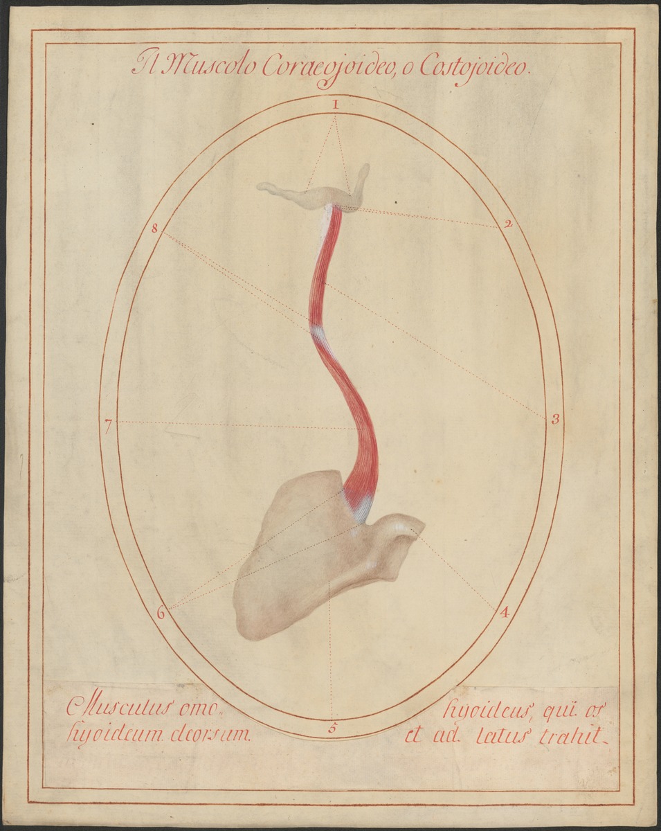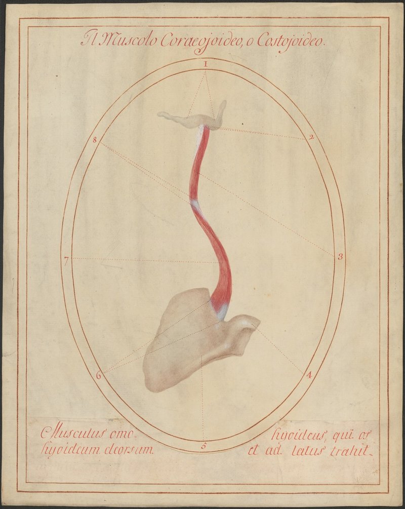 Isolierte Darstellung von Zungenbein (Os hyoideum) und Schulterblatt (Scapula). Musculus omohyoideus.