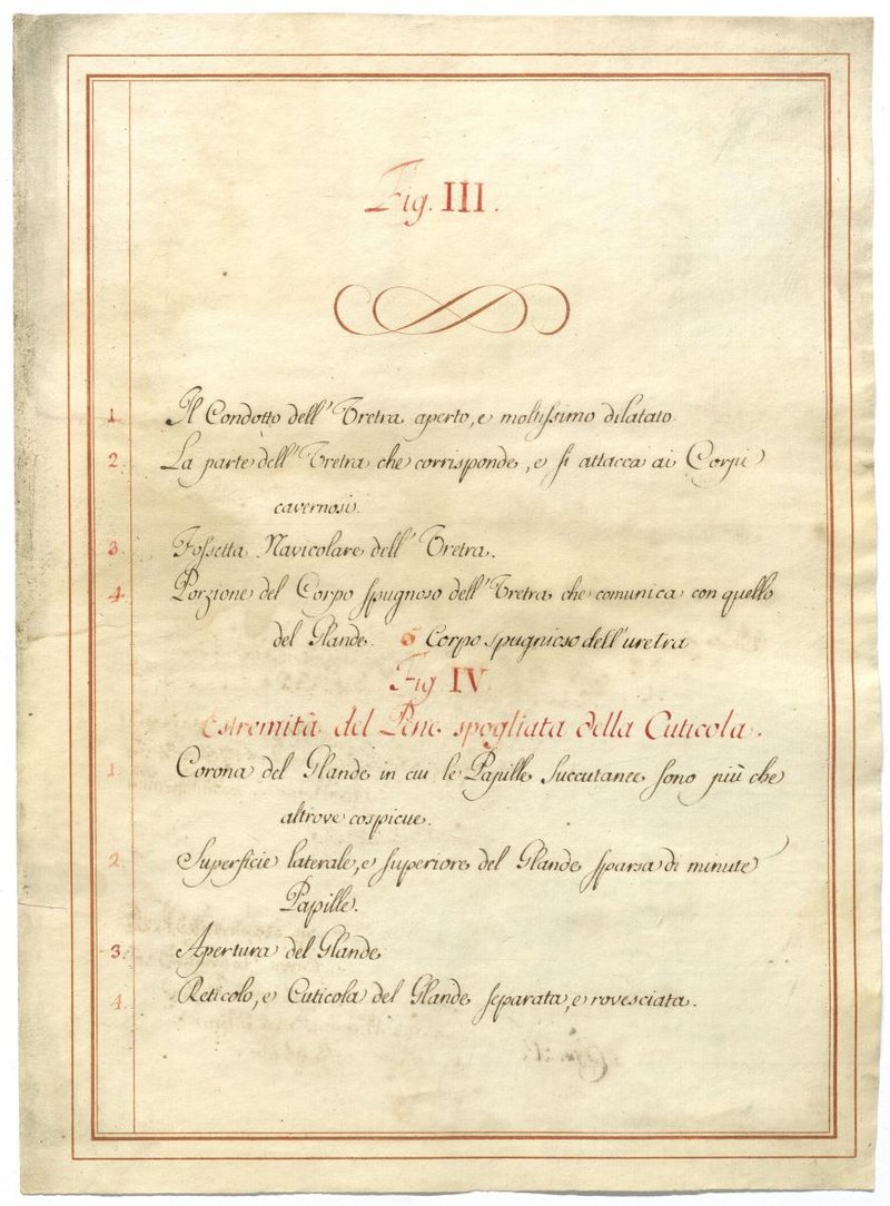 Der Text ist die ergänzende Beschreibung in italienischer Sprache zum anatomischen Wachsmodell der äußeren männlichen Genitale.