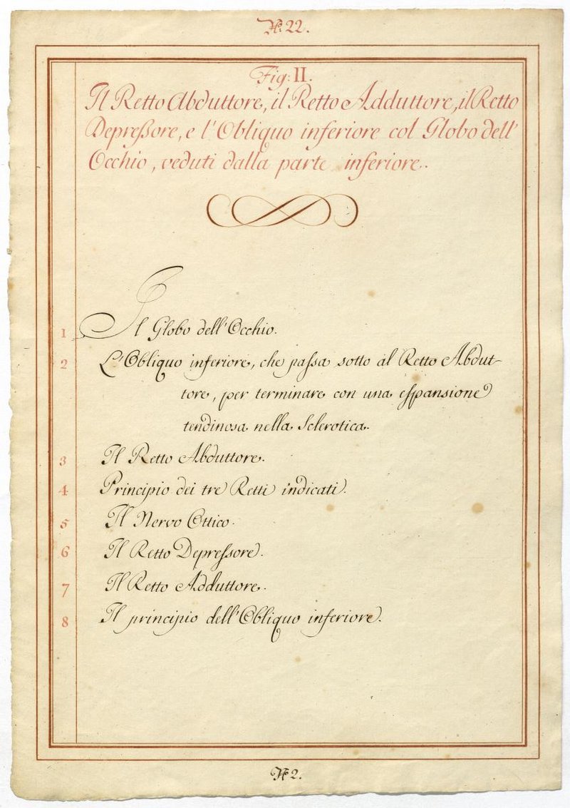 Der Text ist die ergänzende Beschreibung in italienischer Sprache zum anatomischen Wachsmodell der Augenmuskeln.