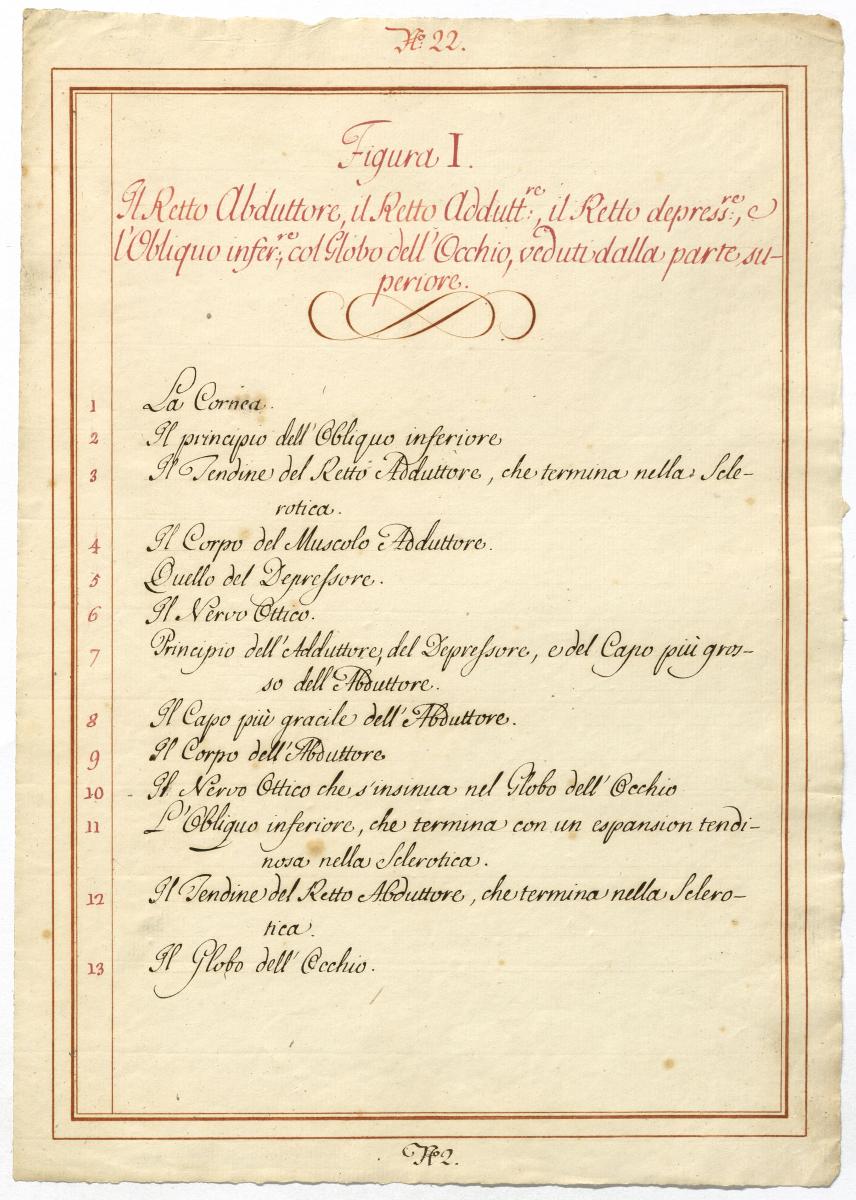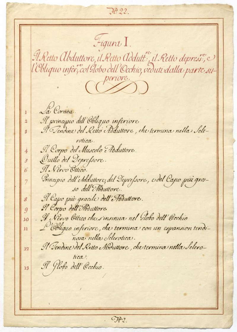 Der Text ist die ergänzende Beschreibung in italienischer Sprache zum anatomischen Wachsmodell der Augenmuskeln.