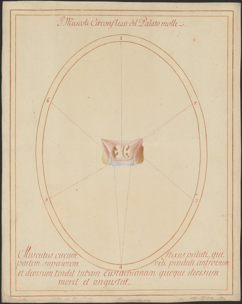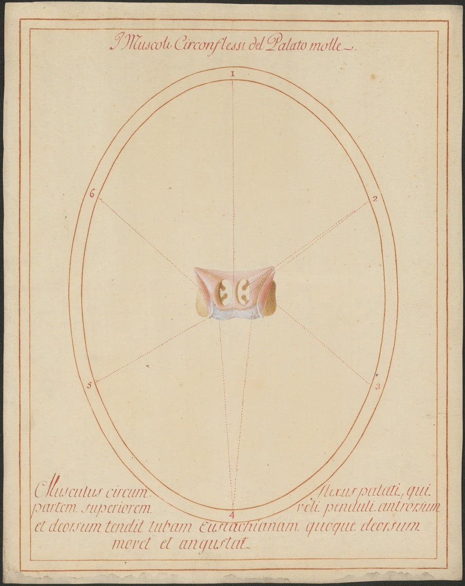 3. Isoliertes Modell des Bereiches der inneren Nasenöffnungen (Choanen) der Schädelbasis von dorsal. Links und rechts der durch die Nasenscheidenwand getrennten Choanen sieht man die Einmündung der Ohrtrompete (Tuba auditiva). Daneben befindet sich der Musculus tensor veli palatini des Gaumensegels.