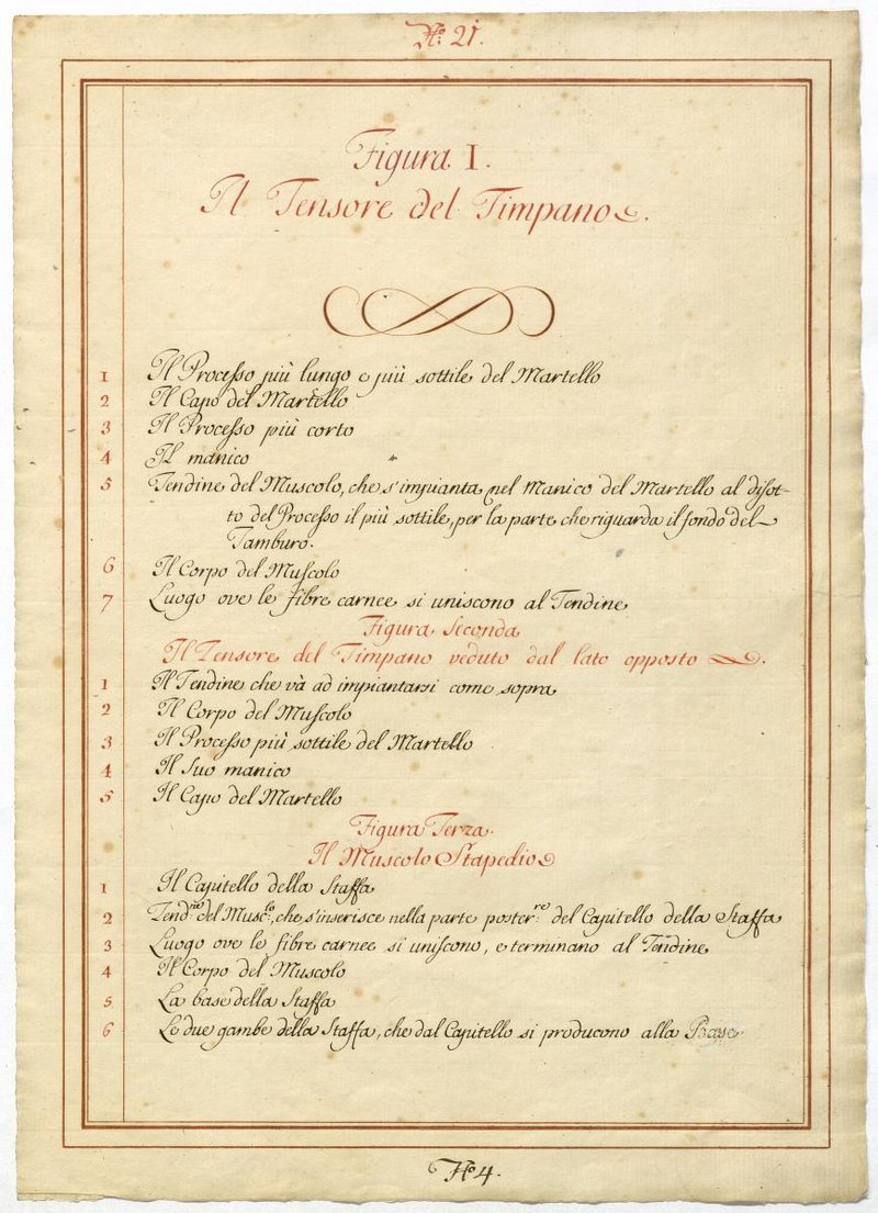 Der Text ist die ergänzende Beschreibung in italienischer Sprache zum anatomischen Wachsmodell des Ohres.