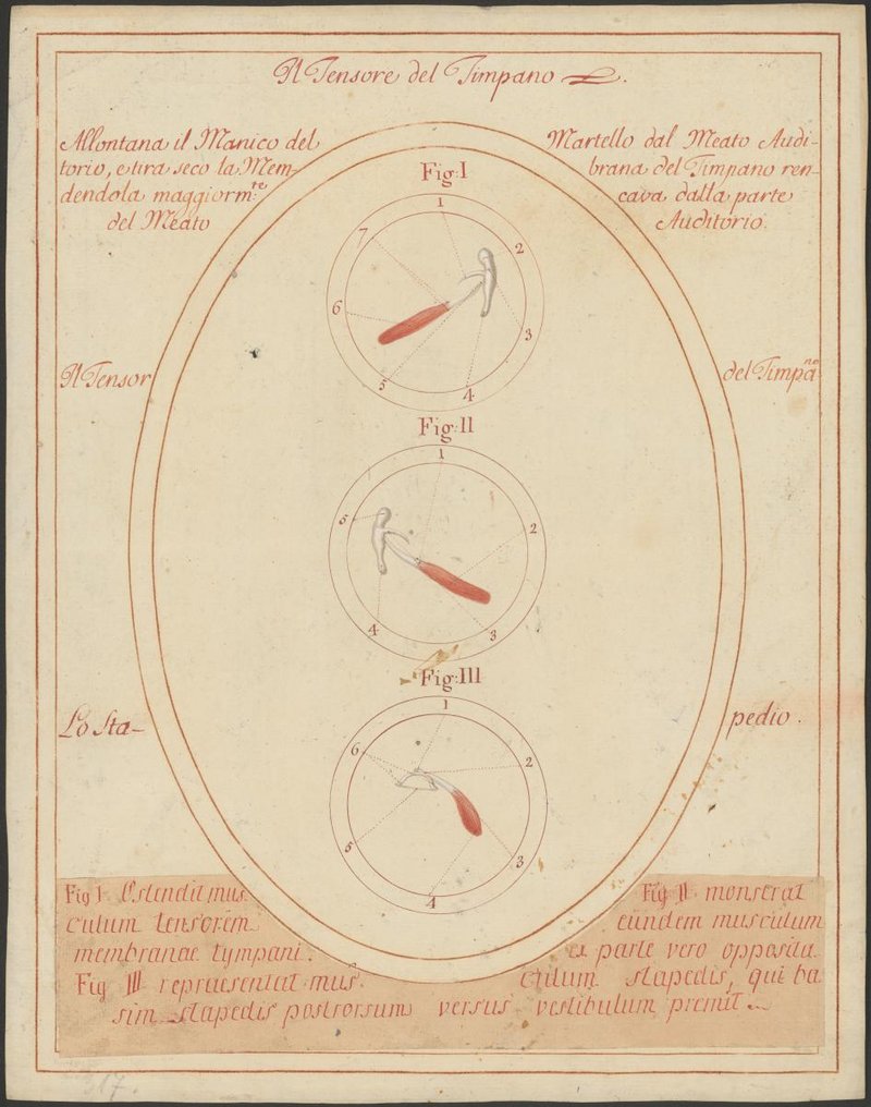 Fig. 1: 316/8: Der Musculus tensor tympani mit dem Hammer (Malleus), in einer anderen Ansicht, vergrößert. Fig 2: 316/6: Der Musculus tensor tympani mit dem Hammer (Malleus), vergrößert dargestellt. Fig 3: 316/7: Der Steigbügel (Stapes) mit seinem Muskel (Musculus stapedius), vergrößert dargestellt.