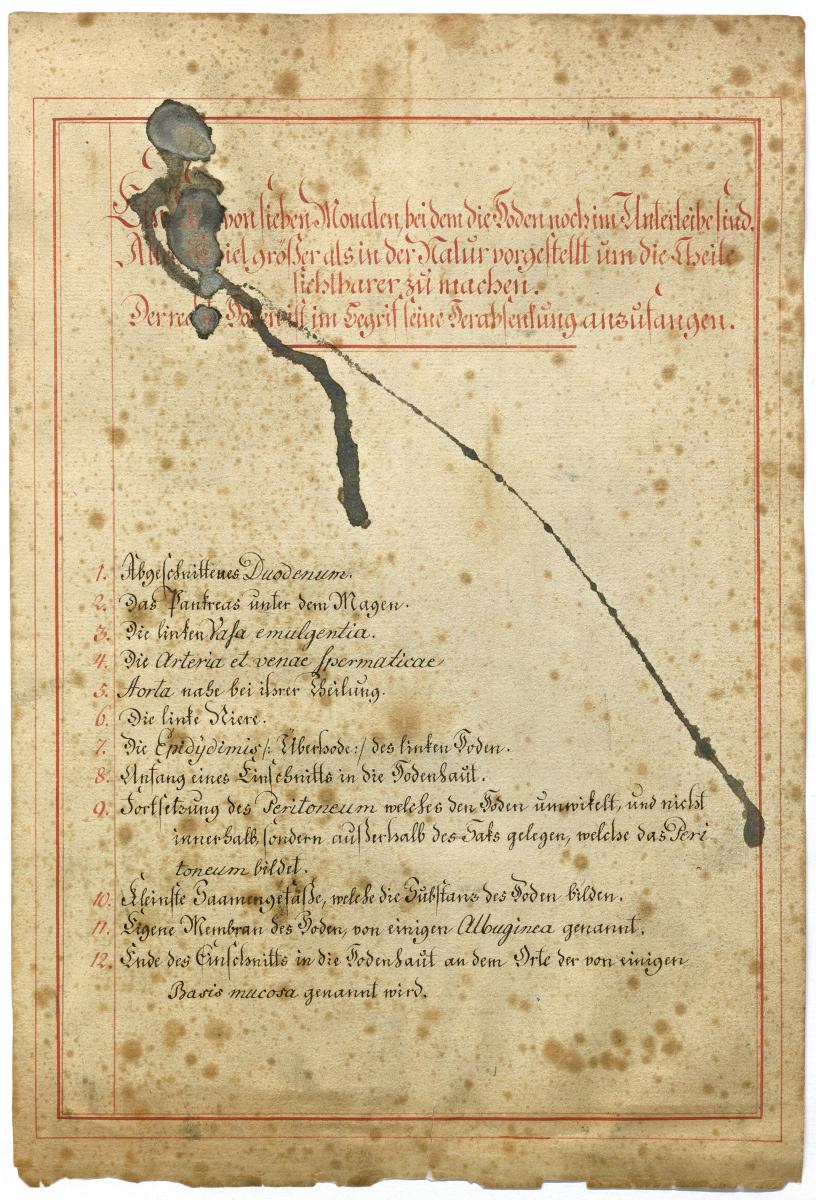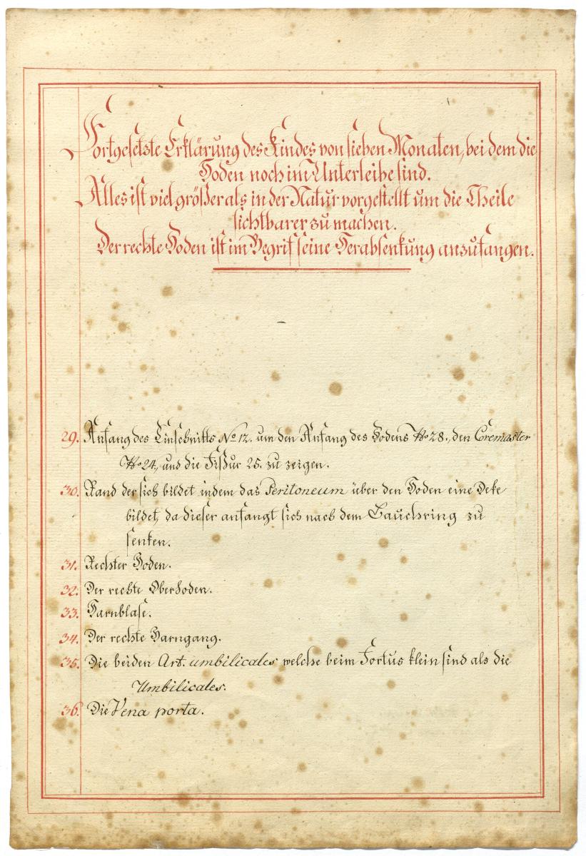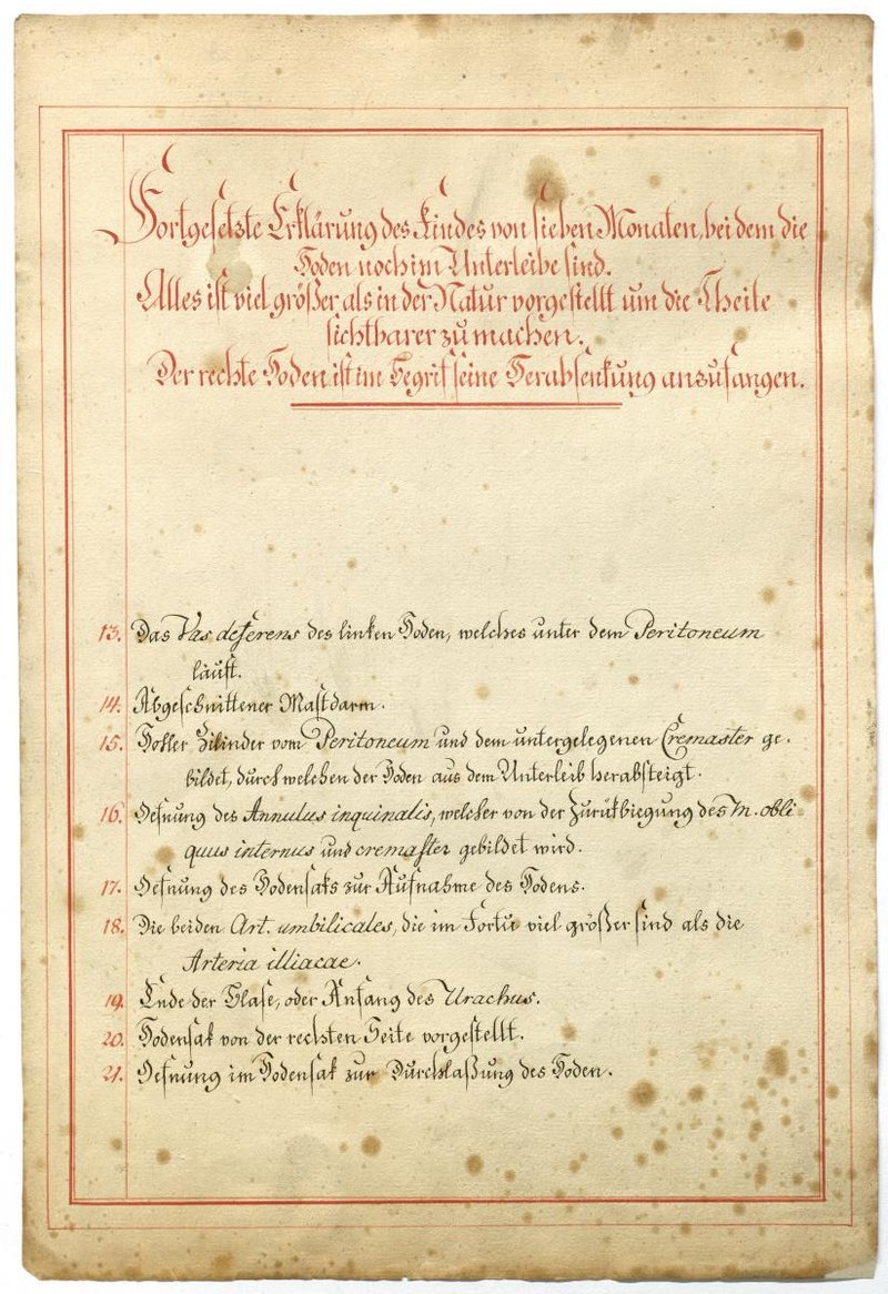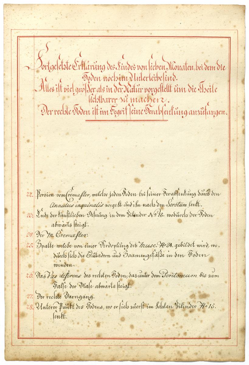 Der Text ist die ergänzende Beschreibung in deutscher Sprache zum anatomischen Wachsmodell des Hodenabstiegs (Descensus testis).