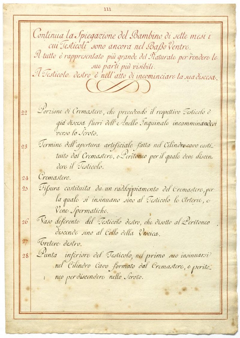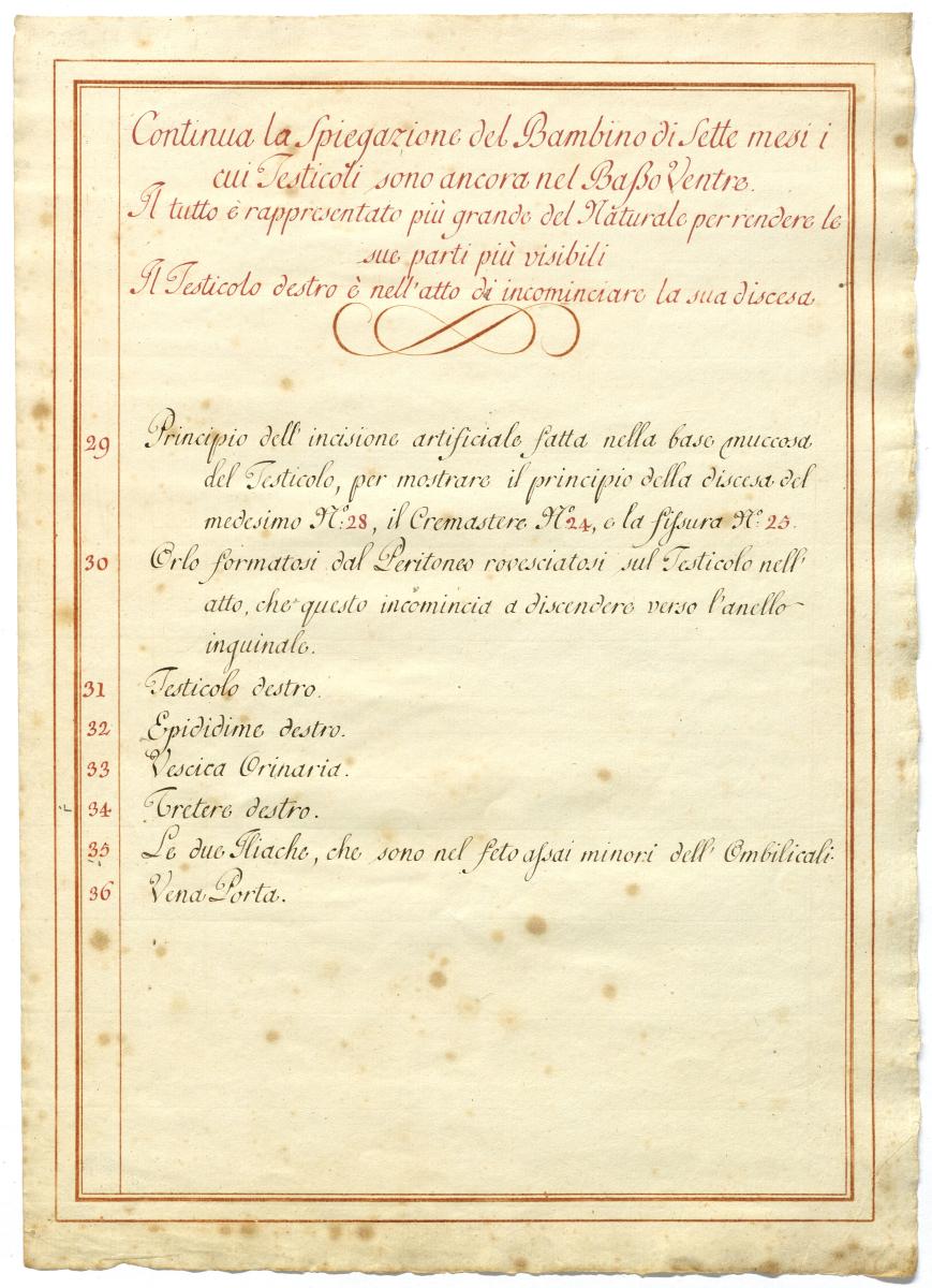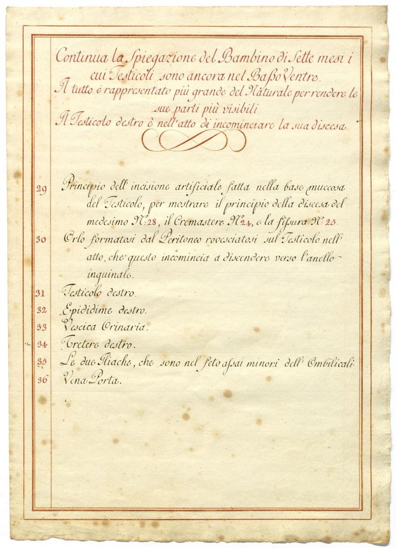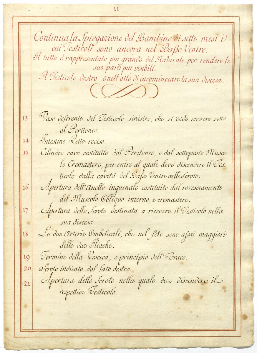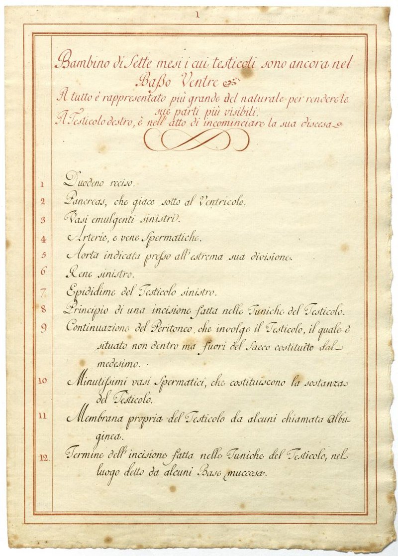 Der Text ist die ergänzende Beschreibung in italiensicher Sprache zum anatomischen Wachsmodell des Hodenabstiegs (Descensus testis).