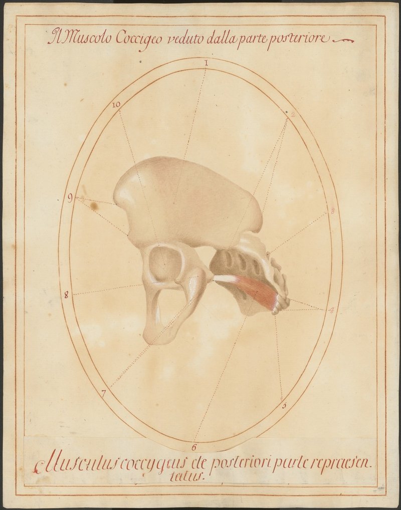 Kreuzbein (Os sacrum) mit Steißbein (Os coccygis) und linker Beckenknochen (Os coxae) von unten. Musculus coccygeus.