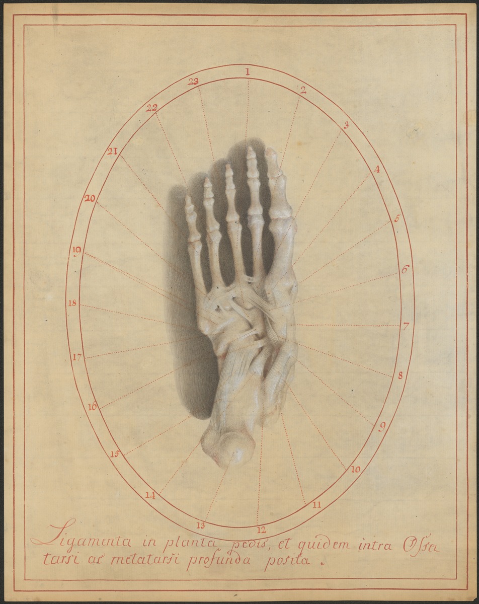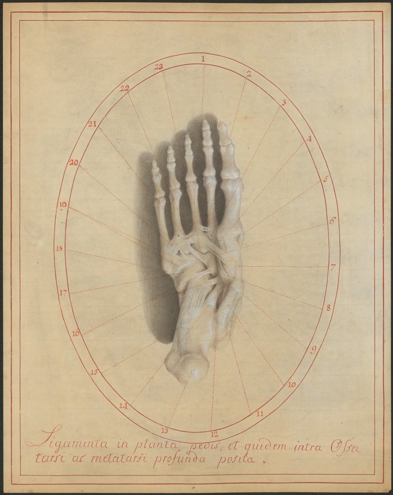 Ansicht der rechten Fußsohle. Haut, Unterhautfettgewebe sowie Muskel und Muskelsehnen sind entfernt und der tiefe Bandapparat der Fußsohle kommt zur Ansicht: die Mittelfußbänder (Ligamenta metatarsea plantaria), die Bänder zwischen Fußwurzel und Mittelfuß (Ligamenta tarsometatarsea plantaria), das lange Fußsohlenband (Ligamentum plantare longum), das Band zwischen Würfelbein und Kahnbein (Ligamentum cuboideonaviculare plantare) und das Band zwischen lateralem Keilbein und Würfelbein (Ligamentum cuneocuboideum plantare) sind dargestellt.