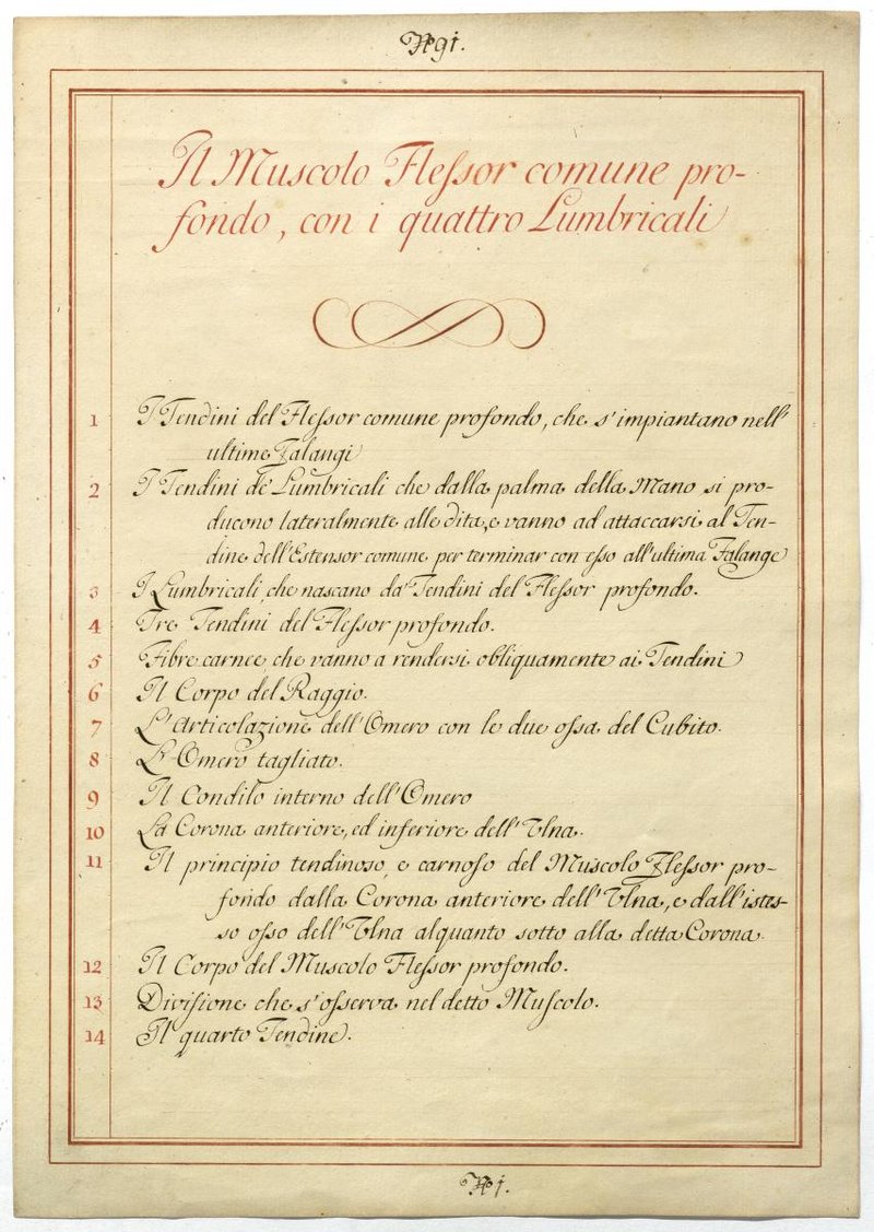 Der Text ist die ergänzende Beschreibung in italienischer Sprache zum anatomischen Wachsmodell der Unterarmmuskeln.
