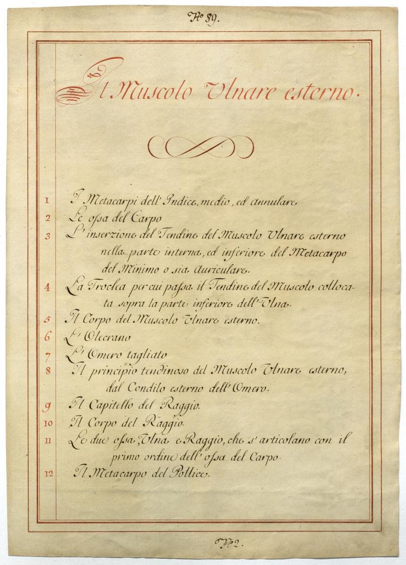 Der Text ist die ergänzende Beschreibung in italienischer Sprache zum anatomischen Wachsmodell der Unterarmmuskeln.