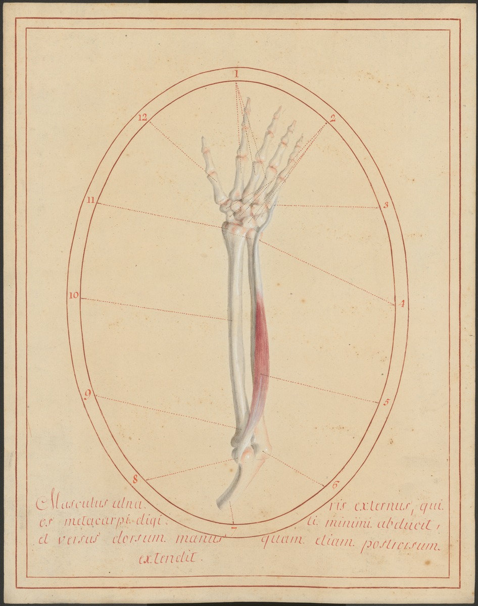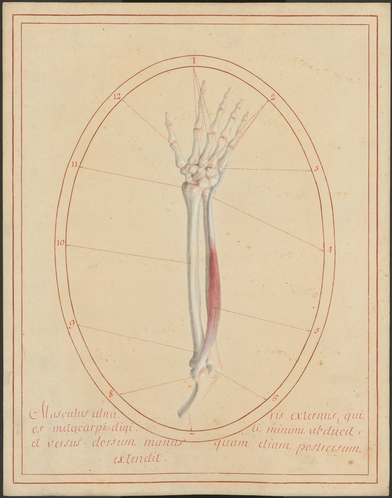 Distaler Oberarmknochen (Humerus), Unterarmknochen – Elle (Ulna) und Speiche (Radius) und Knochen der Hand der rechten Seite von hinten. Musculus extensor carpi ulnaris.
