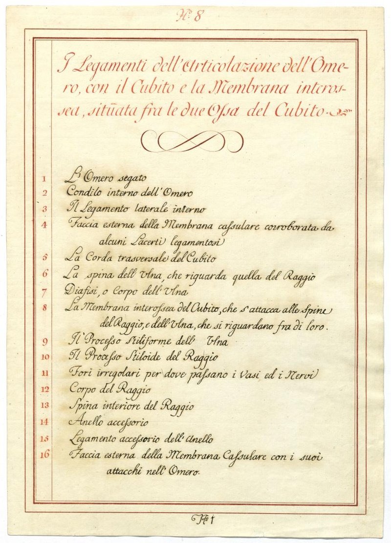 Der Text ist die ergänzende Beschreibung in italienischer Sprache zum anatomischen Wachsmodell des Unterarms, Ellenbogens und Handgelenks.