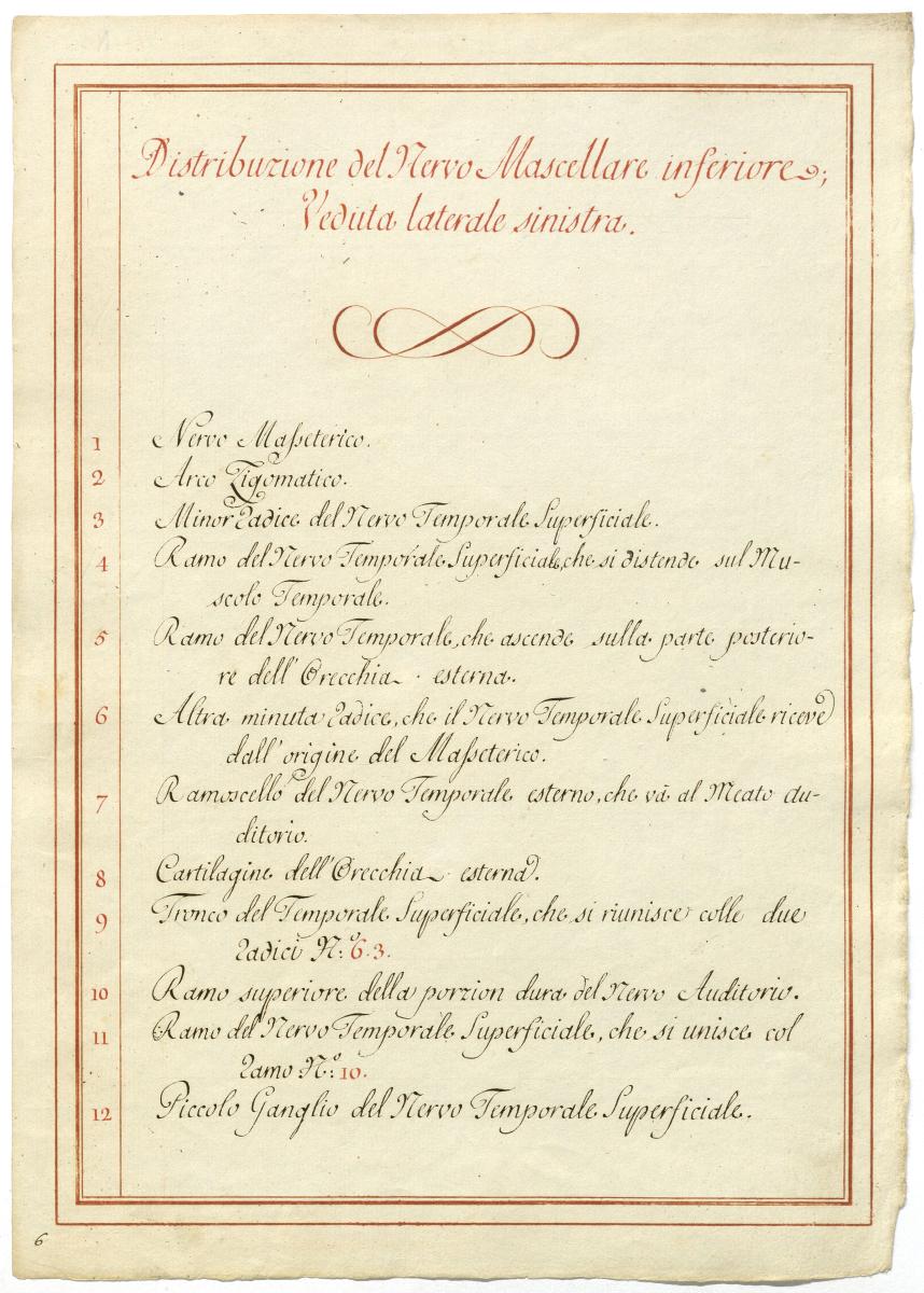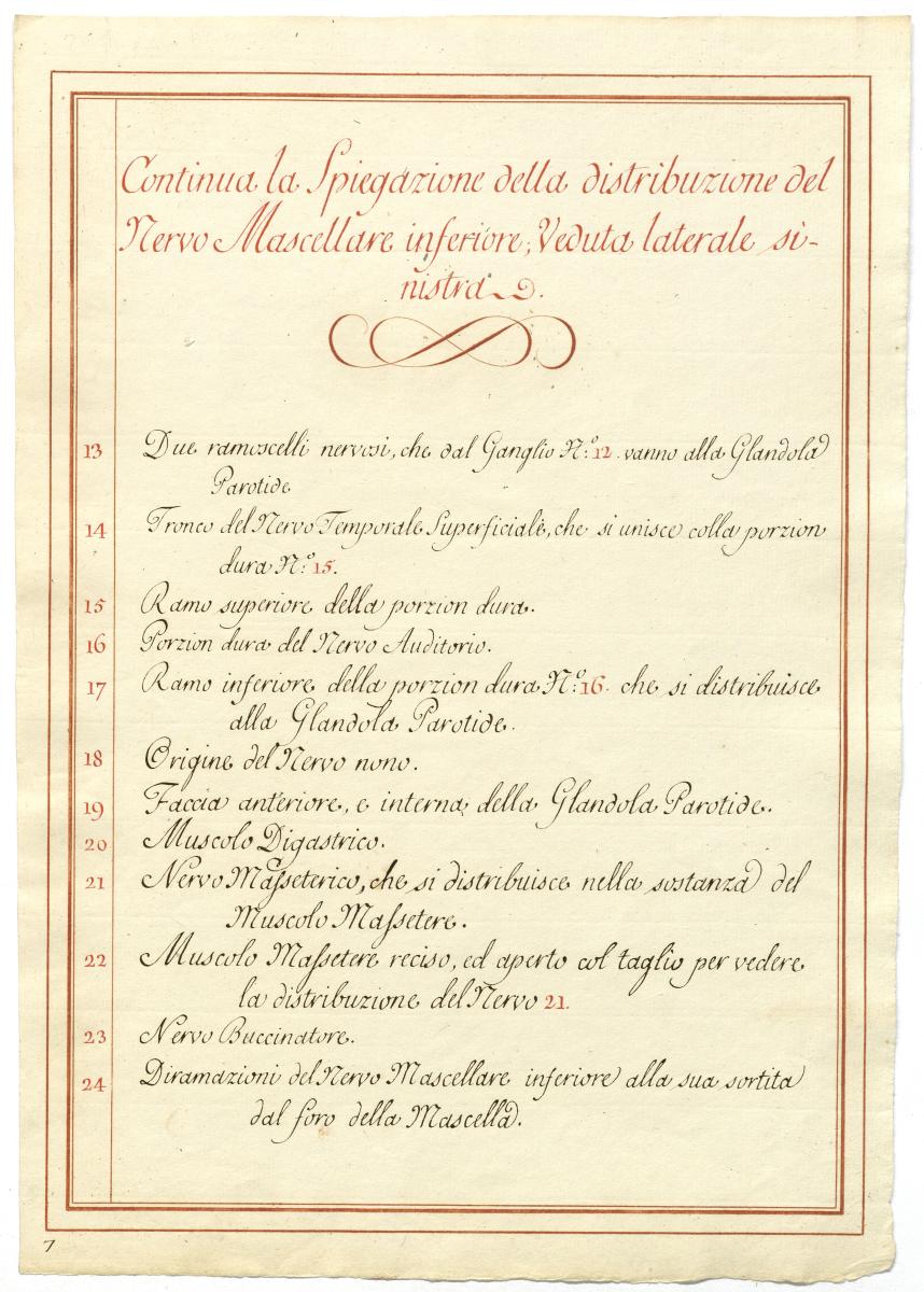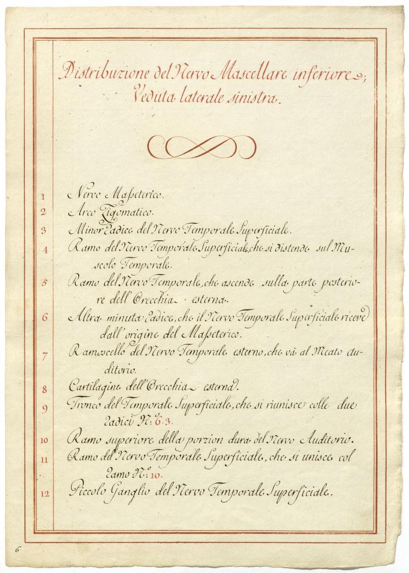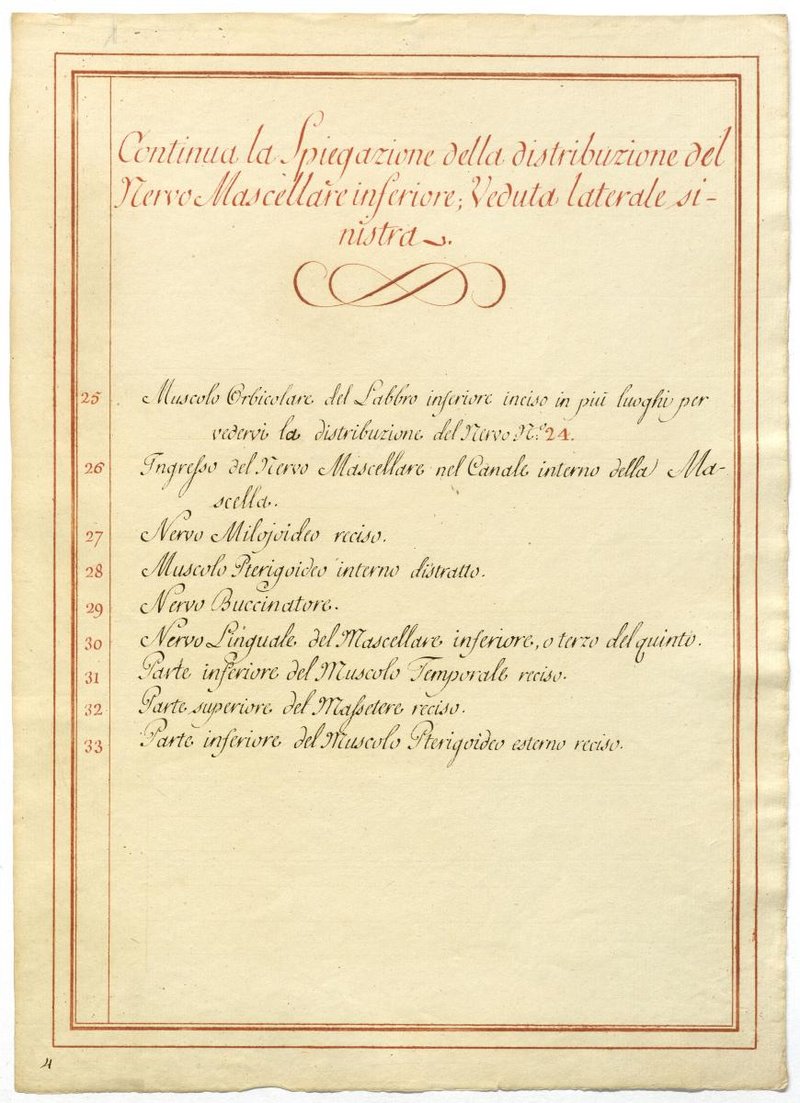 Der Text ist die ergänzende Beschreibung in italienischer Sprache zum anatomischen Wachsmodell des Nervus mandibularis.