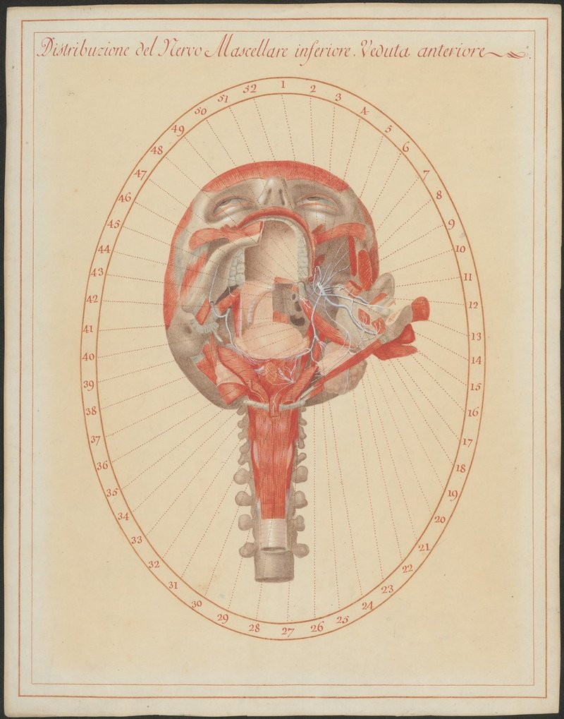 Kopf-Halsbereich, der Unterkiefer ist entfernt. Dargestellt ist der Nervus mandibularis, der dritte Ast des 5. Hirnnerven (Nervus trigeminus) mit zwei seiner sensiblen Ästen, dem Nervus buccalis dem Nervus lingualis.