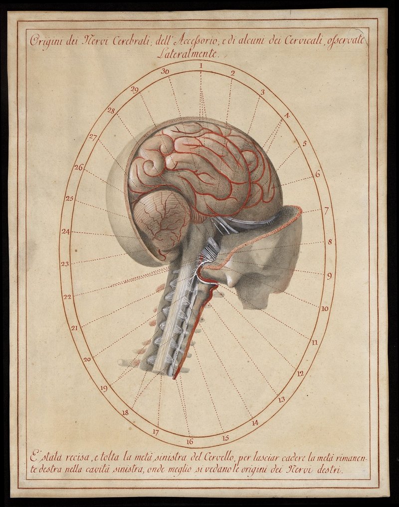 Der Ursprung der Hirnnerven (Nn. craniales) und der oberen Halsnerven (Nn. cervicales).