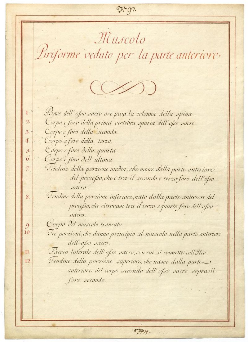 Der Text ist die ergänzende Beschreibung in italienischer Sprache zum anatomischen Wachsmodell der Hüftmuskulatur.