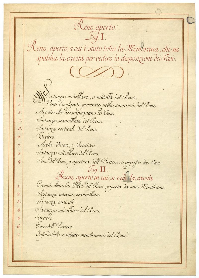 Der Text ist die ergänzende Beschreibung in italienischer Sprache zum anatomischen Wachsmodell der Nieren.